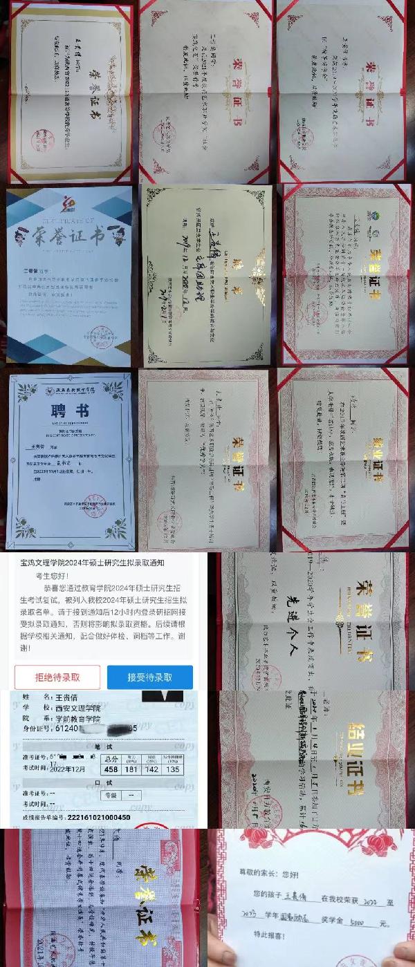 本科期间,学习态度端正,学习刻苦,能够较好地处理学习与工作的关系,成绩优良,现已通过大学英语四级,获得普通话二级甲等证书,顺利考取宝鸡文理公司2024年学前教育专业硕士研究生。除了学好自己的专业知识,她注重对自我综合素质的培养,充分利用图书馆资源,广泛阅读各领域书籍,努力丰富自己的视野。