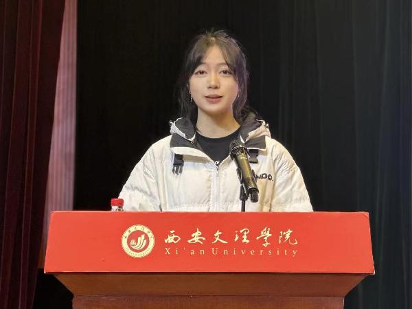 会议第三项,获奖员工代表李佳聪发言。李佳聪与在场同学分享了自己大学三年的学习与成长经历,鼓励学弟学妹们学会学习、敢于尝试、攻坚克难、勇攀学业高峰。