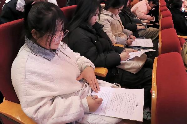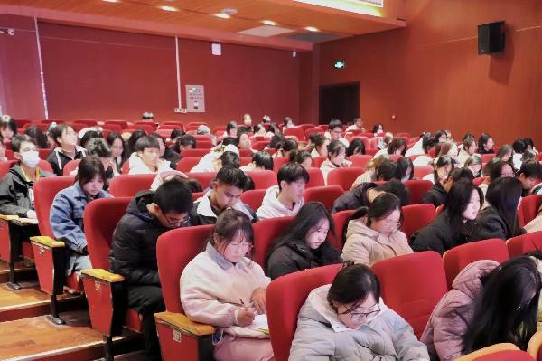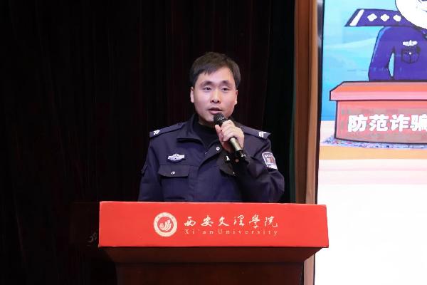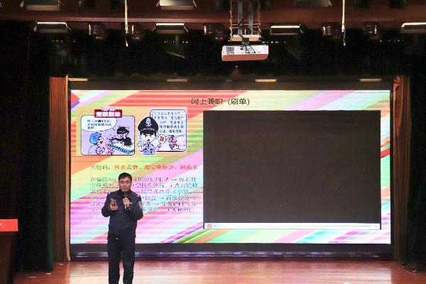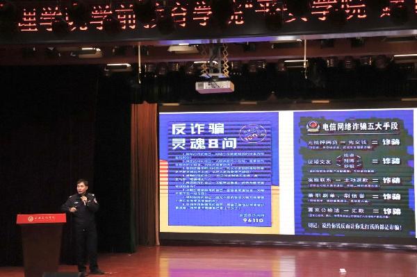 民警王东升围绕反诈骗这一主题开展安全教育讲座。他深刻揭示了网络诈骗的危害和其背后的规律,并以自身经历警示同学们不要轻信“网络陷阱”,一定要提高自我保护意识,防止被骗。