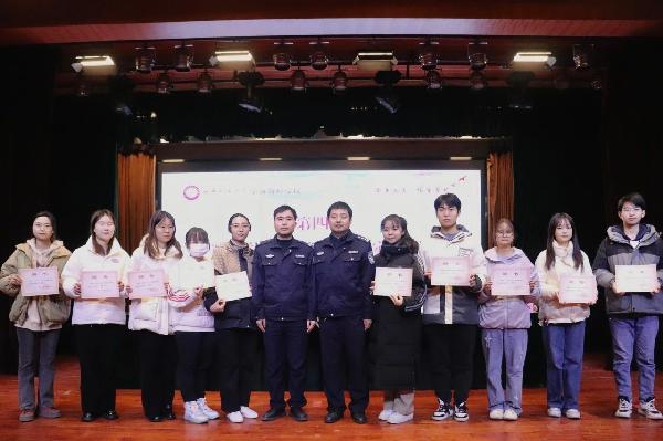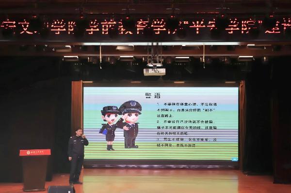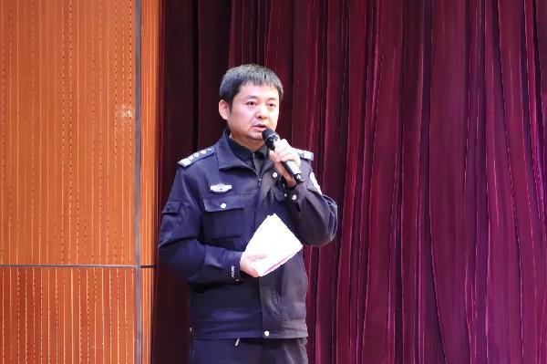 会议第二阶段,民警孙鹏从法制、消防、治安与交通安全等方面开展讲座。他结合自身经验,告诫同学们要时刻保持警惕意识,保护自身安全。