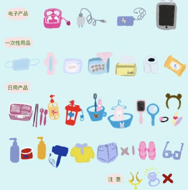 虽说携带一些必备用品很有必要,但小伙伴们还是要记得以精简为主哦!轻装上阵能减少不少负担。此外,大家也要记得带好手机、耳机、平板等贵重物品,以免丢失。