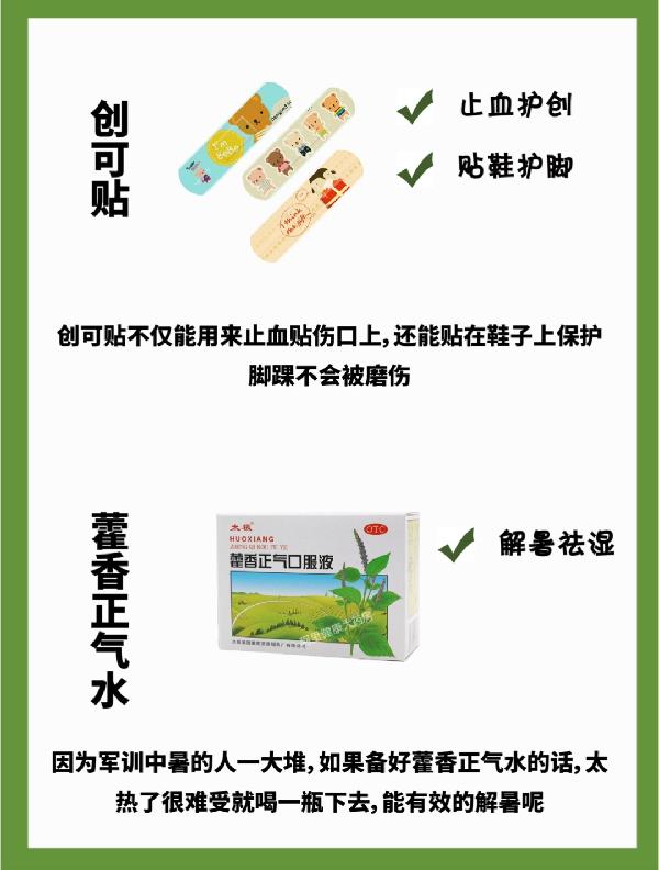 在这么毒辣的太阳底下,中暑可是很容易的事情,不带一些防中暑的药物怎么行呢?除此之外,易招蚊虫叮咬的小伙伴记得带好花露水哦!军营里的蚊虫都像是训练有素,又毒又狠,咬起人来丝毫不手下留情!