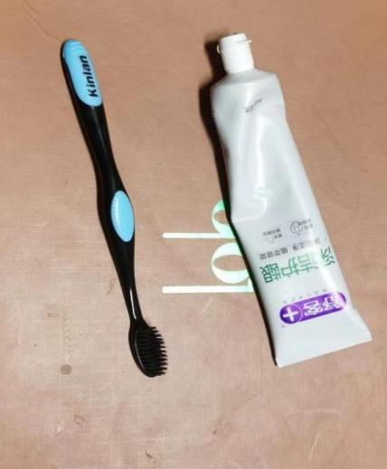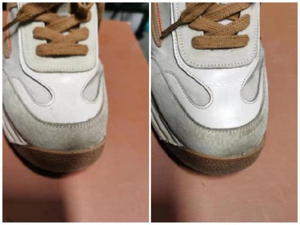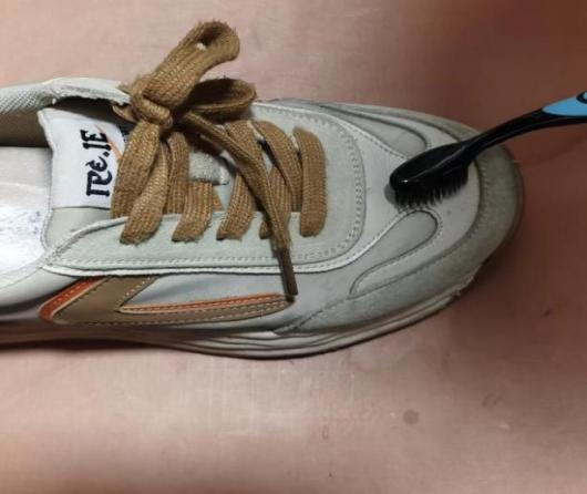 1.准备一只废旧牙刷和普通牙膏,将鞋面用温水淋湿。
