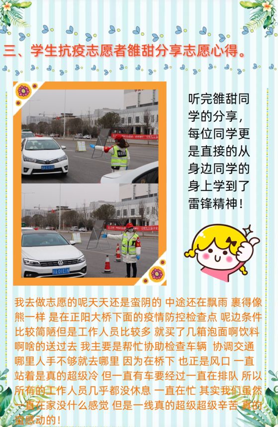 在本次疫情面前,公司学子不畏艰难,用实际行动向雷锋同志学习,践行了“奉献、友爱、互助、进步”的志愿精神。1603班任芳冰、李莉莎等5名同学参加村委会、社区志愿服务,1704班雒甜、1804班雷田欣、贺娟参与到了疫情防控工作,1901朱水萍、陈英志愿为小员工辅导作业,1708班韩艳琴、崔阳等干部组织班级同学在防疫情的基础上展开帮助小区捡垃圾,打扫楼道,协助社区有关疫情的工作等……