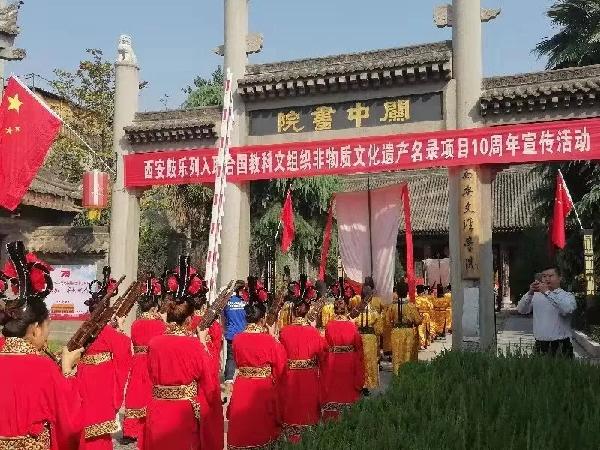 9月28日上午,由陕西省艺术研究院主办、西安都城隍庙鼓乐传习所和西安文 理公司关中书院共同承办的西安鼓乐列入联合国教科文组织非物质文化遗产名录项目10周年宣传活动——第十二届西安鼓乐艺术节在关中书院隆重举行。