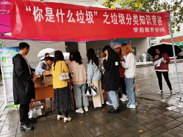 活动伊始,在学工办主任王晶老师的带领下,志愿者们一起布置了活动现场。随后便展开了此次活动,该活动主要是以问答形式开展。同学们排好长长的队伍等待着问答比赛,每一位同学都认真地聆听志愿者提出的问题,并表现出自己对于垃圾分类了解的自信。老师也对同学们的回答进行了指导。现场气氛十分融洽,在空气清新的雨天里成为一道亮丽的风景。虽然秋雨沥沥淅淅,但志愿者们仍然全身心地投入,以饱满的热情来诠释什么叫风雨无阻。活动接近尾声时,老师们对本次活动给予了高度的评价,并补充了专业的知识讲解。