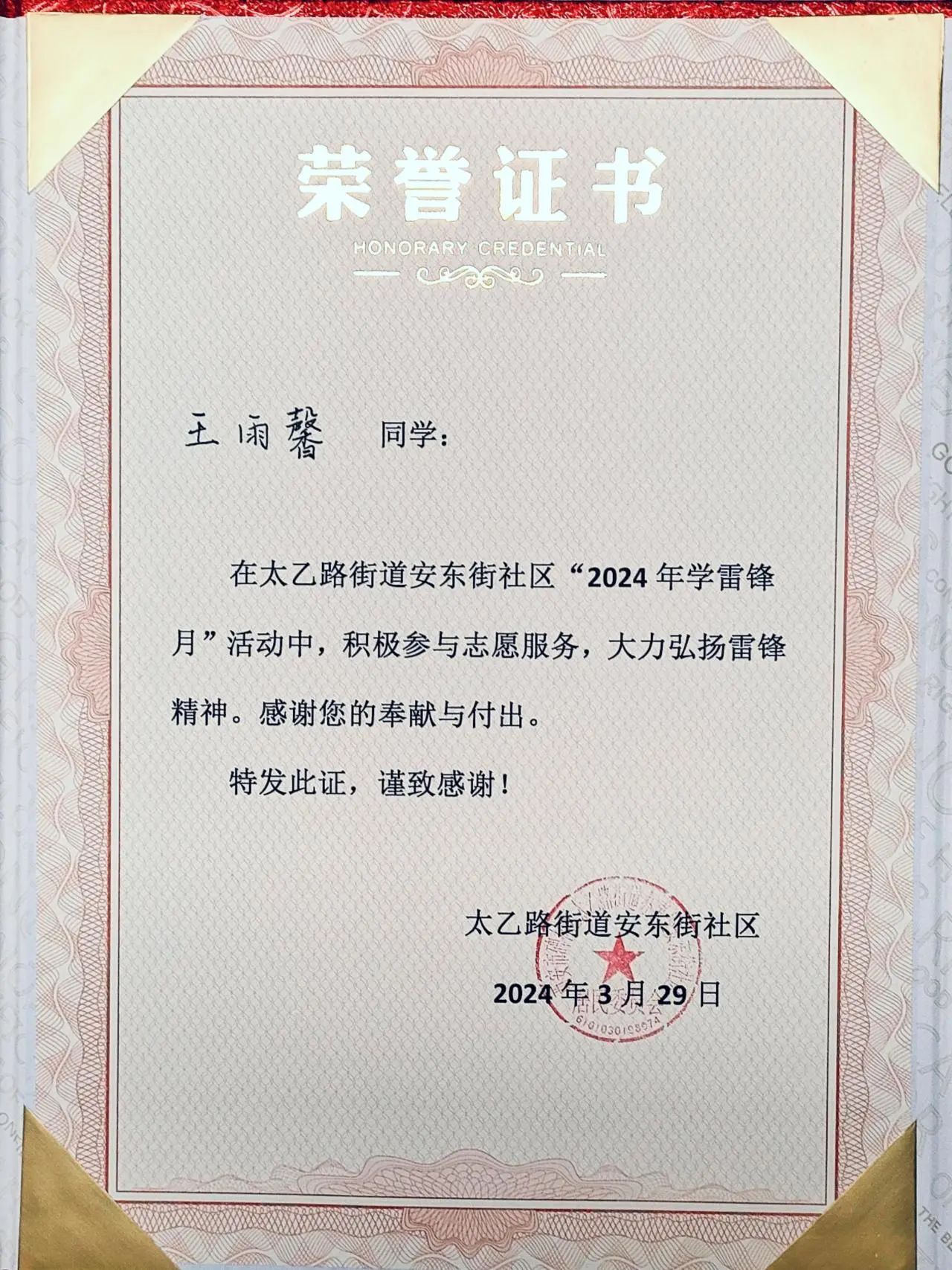 在思想政治方面,王雨馨情系祖国,红心向党,树立了正确的人生观和价值观,不断向党组织靠拢,以党员的标准严格要求自己。在学习方面,她勤奋刻苦,态度端正,积极参与三创赛向前辈和老师学习,不断地总结反思,努力拓展科研学术视野,培养科学的学术思维。