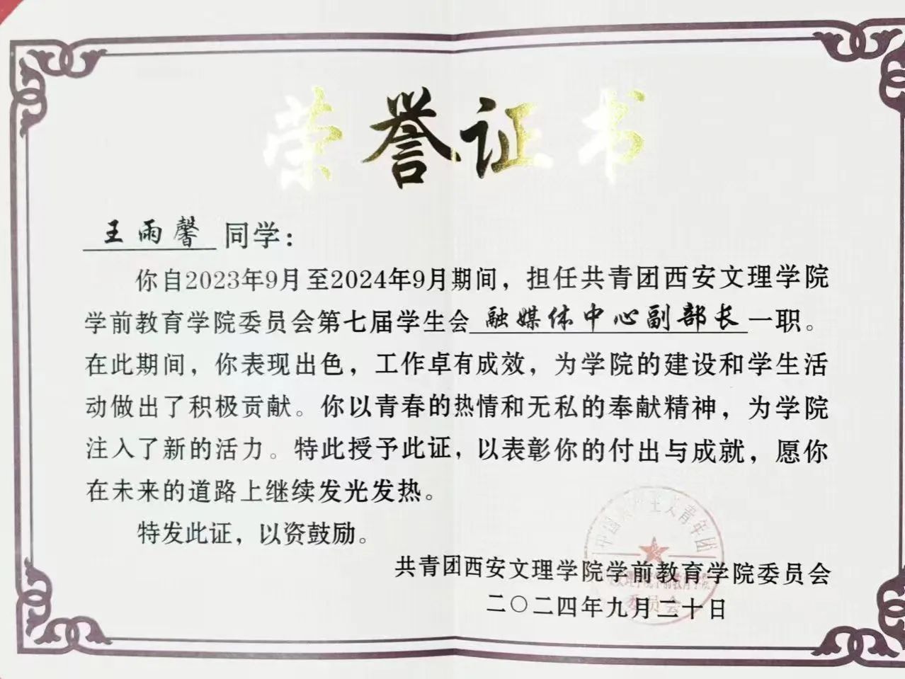 在员工工作方面,她曾作为院团委员工会融媒体中心副部长,负责院公众号的网页图片的拍摄制作、把控整体美工、部门干事的培训等工作,积极协助老师筹备活动,并参加暑期政府实习及“三下乡”等社会实践活动,热心服务同学,努力提升其综合能力,坚持德智体美劳全面发展。