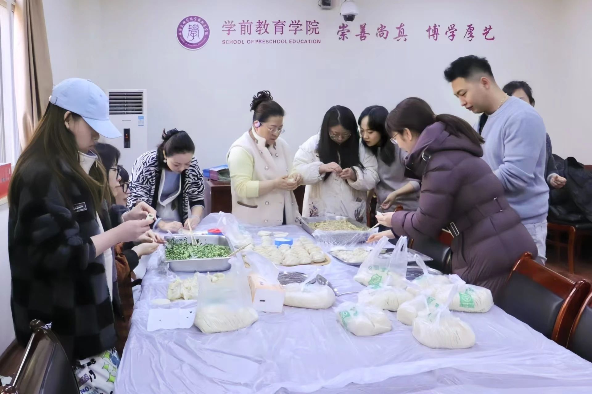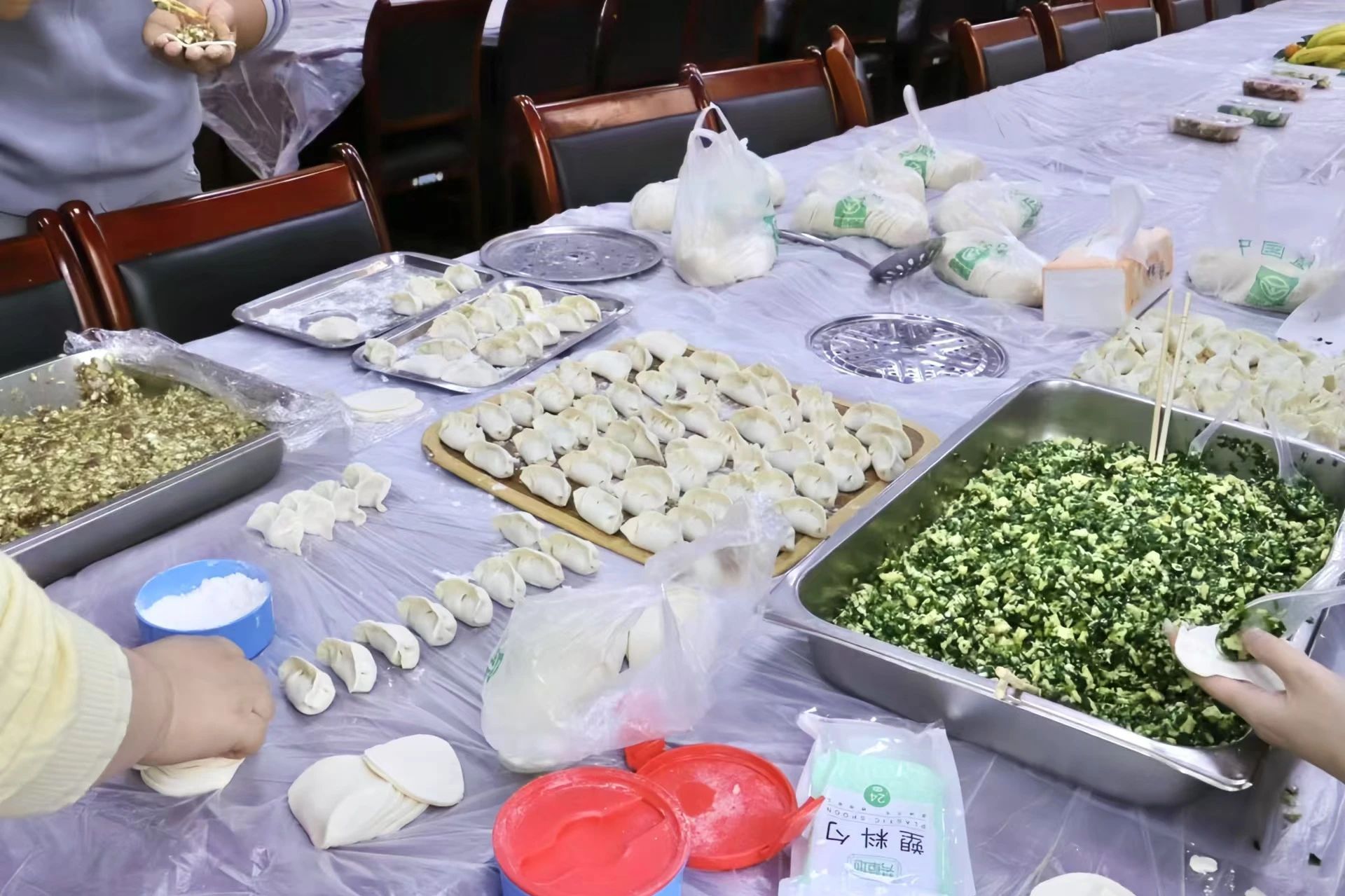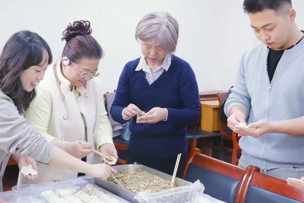 师生们纷纷动手,大家有说有笑,其乐融融。许多同学是第一次亲手包饺子,虽然手法略显生疏,但大家的热情和积极性丝毫未减。老师们在旁边耐心指导,传授包饺子的技巧和经验,师生共同感受着节日的温情。
