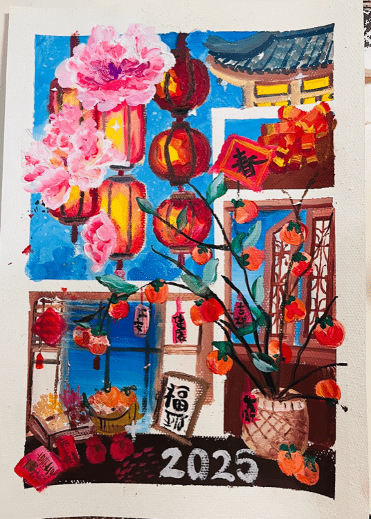 这幅画洋溢着浓郁的中国春节氛围。鲜艳的大红灯笼高高悬挂,与粉嫩的牡丹相映成趣,传递出喜庆与富贵之意。窗棂边,满枝的红柿寓意事事如意,旁边“福”字与“春”字的春联,更是增添了新春的吉祥之感。我以传统的中式建筑作为背景,古朴而典雅。这幅作品整体色彩明快,笔触活泼,将春节时热闹、祥和、团圆的气氛展现得淋漓尽致。