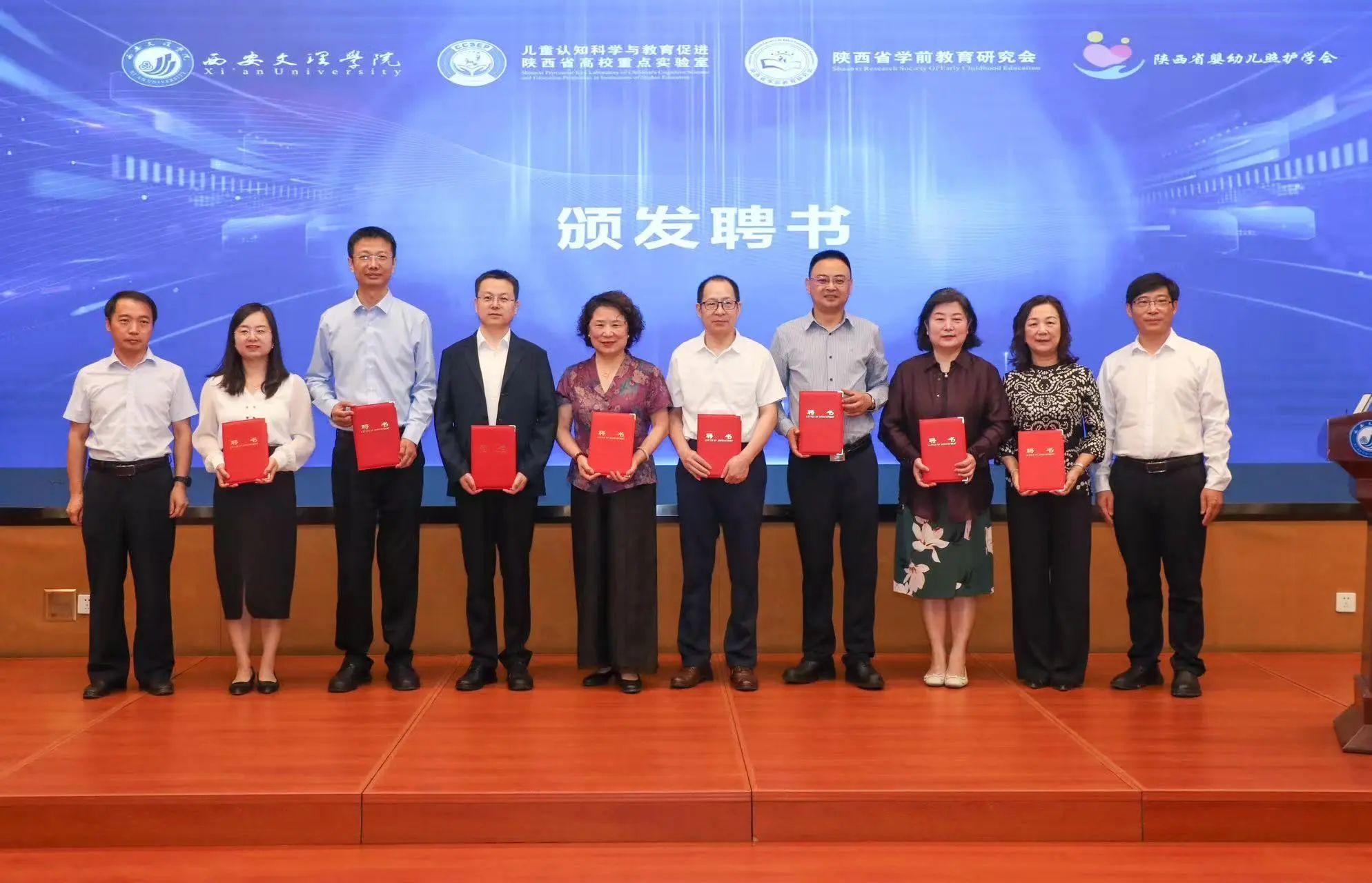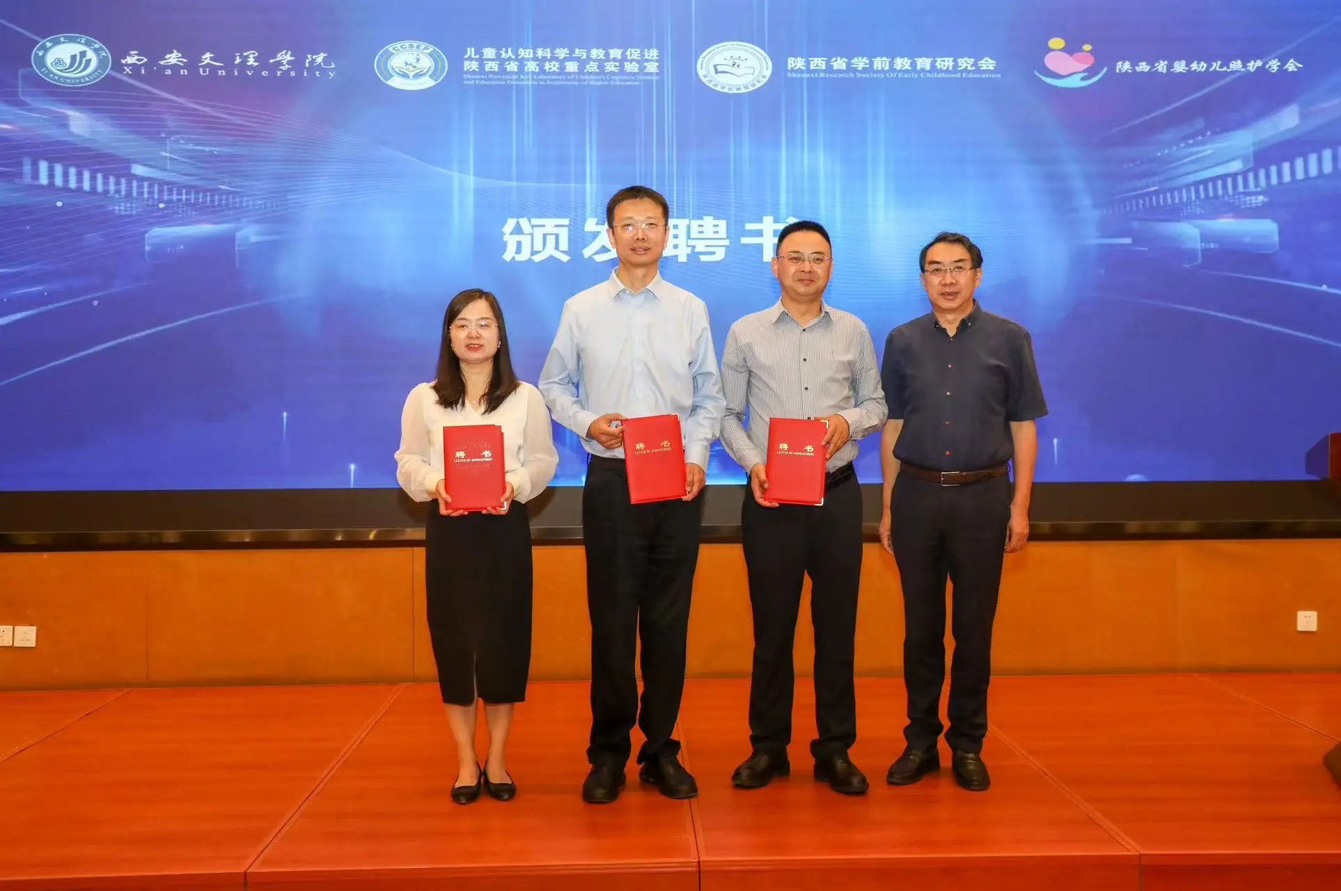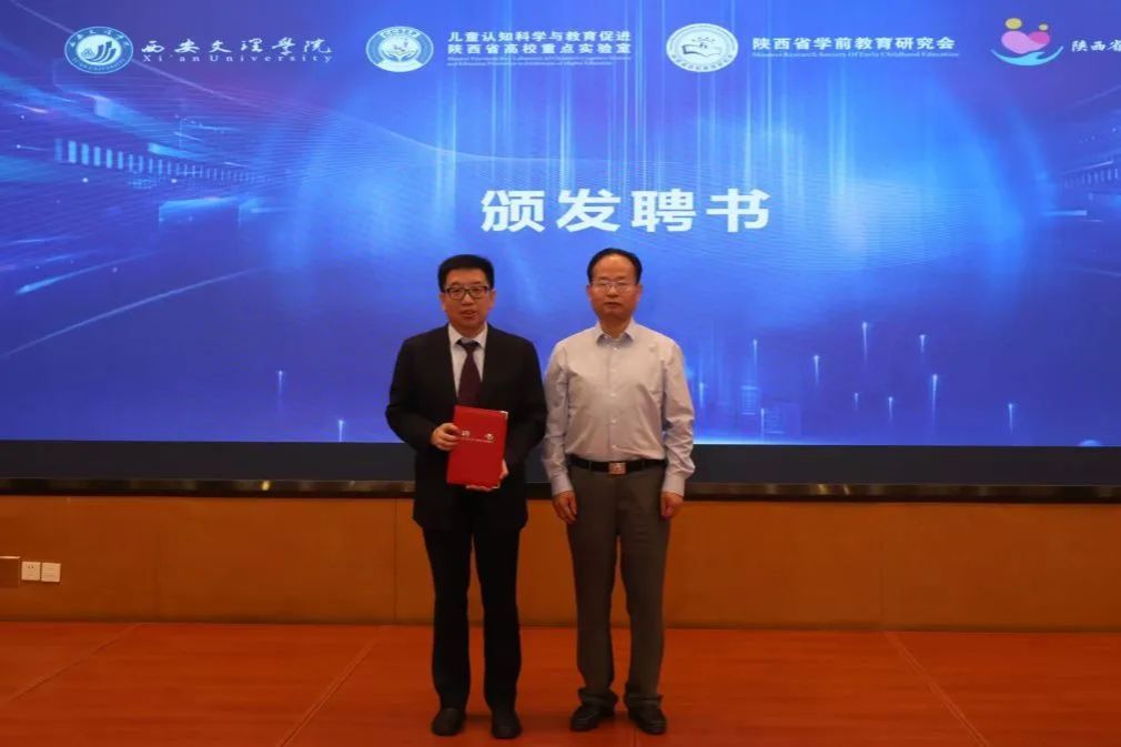 在颁发聘书环节,陕西省学前教育研究会罗侃淳会长为实验室主任蔡军、副主任路娟和段海军颁发了聘书。西安市教育局王纲副局长为实验室学术委员会主任秦金亮颁发了聘书。西安高新区教育体育局邓巍局长与雁塔区教育局左自文副局长为实验室学术委员会委员颁发了聘书。