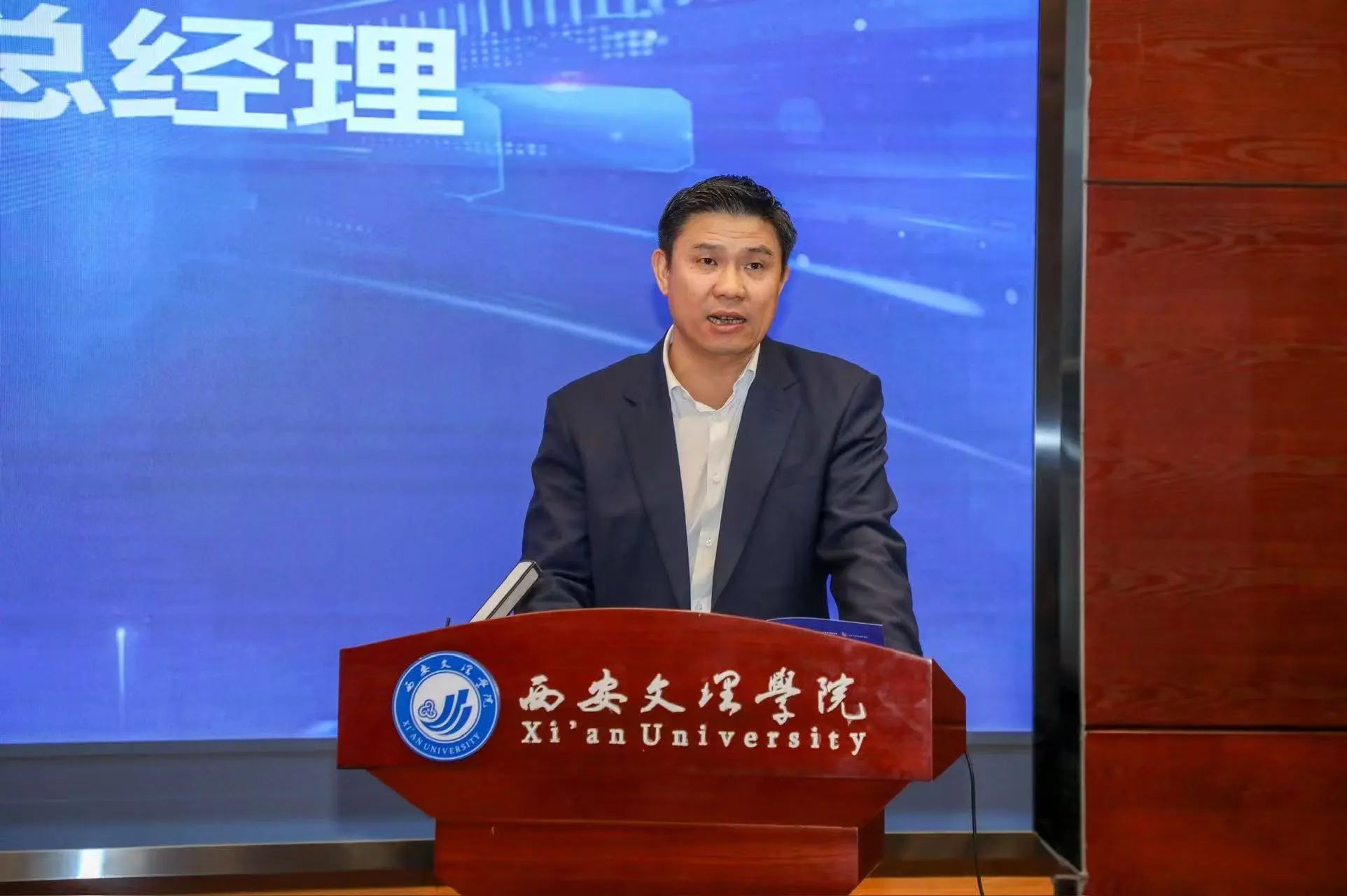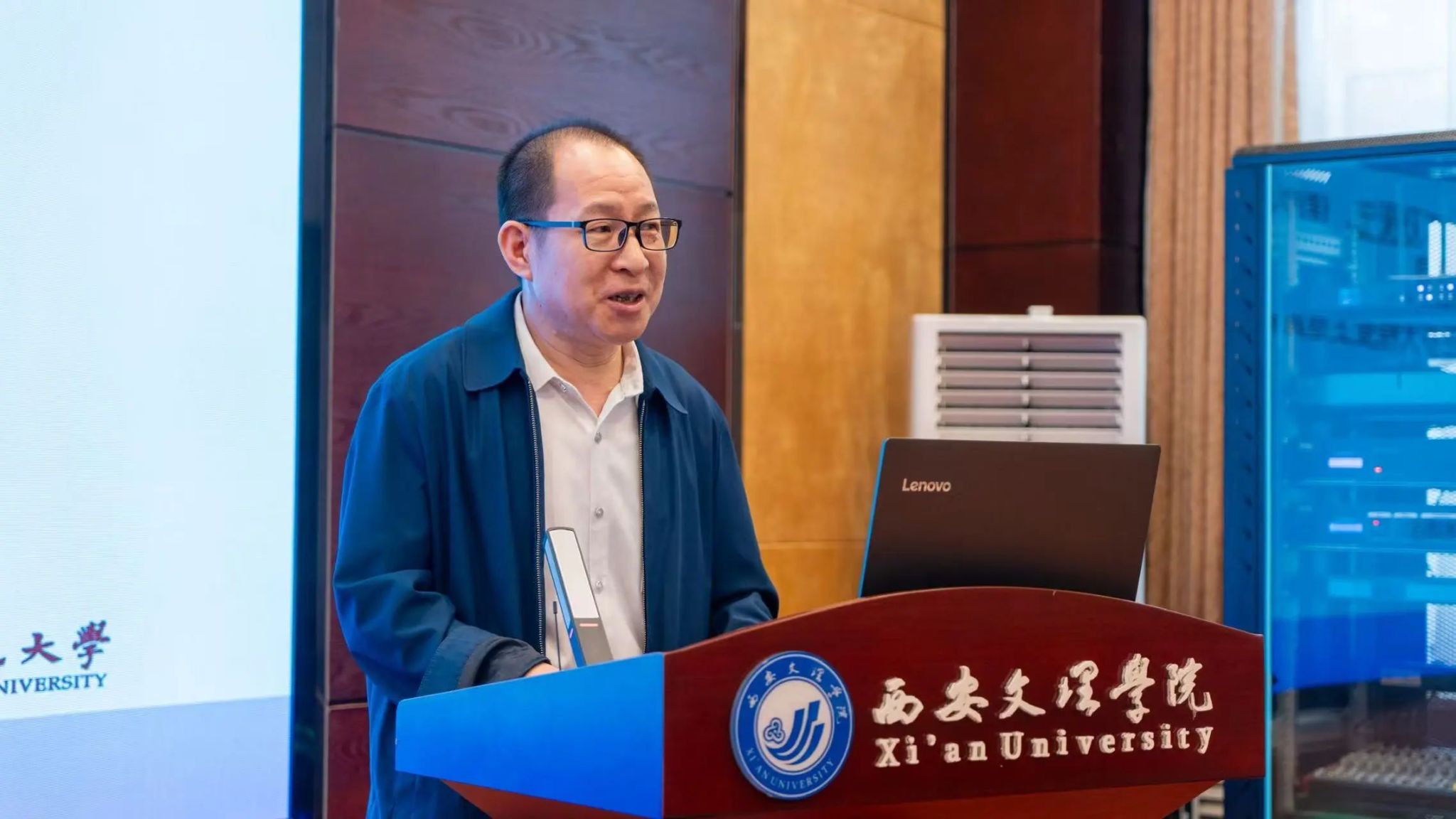 重点实验室学术委员会主任秦金亮教授致辞,希望实验室以真实场景、便携式穿戴设备,以及强人形机器人的智能感知为方法突破口,做出中国特色、中国场景的好研究。
