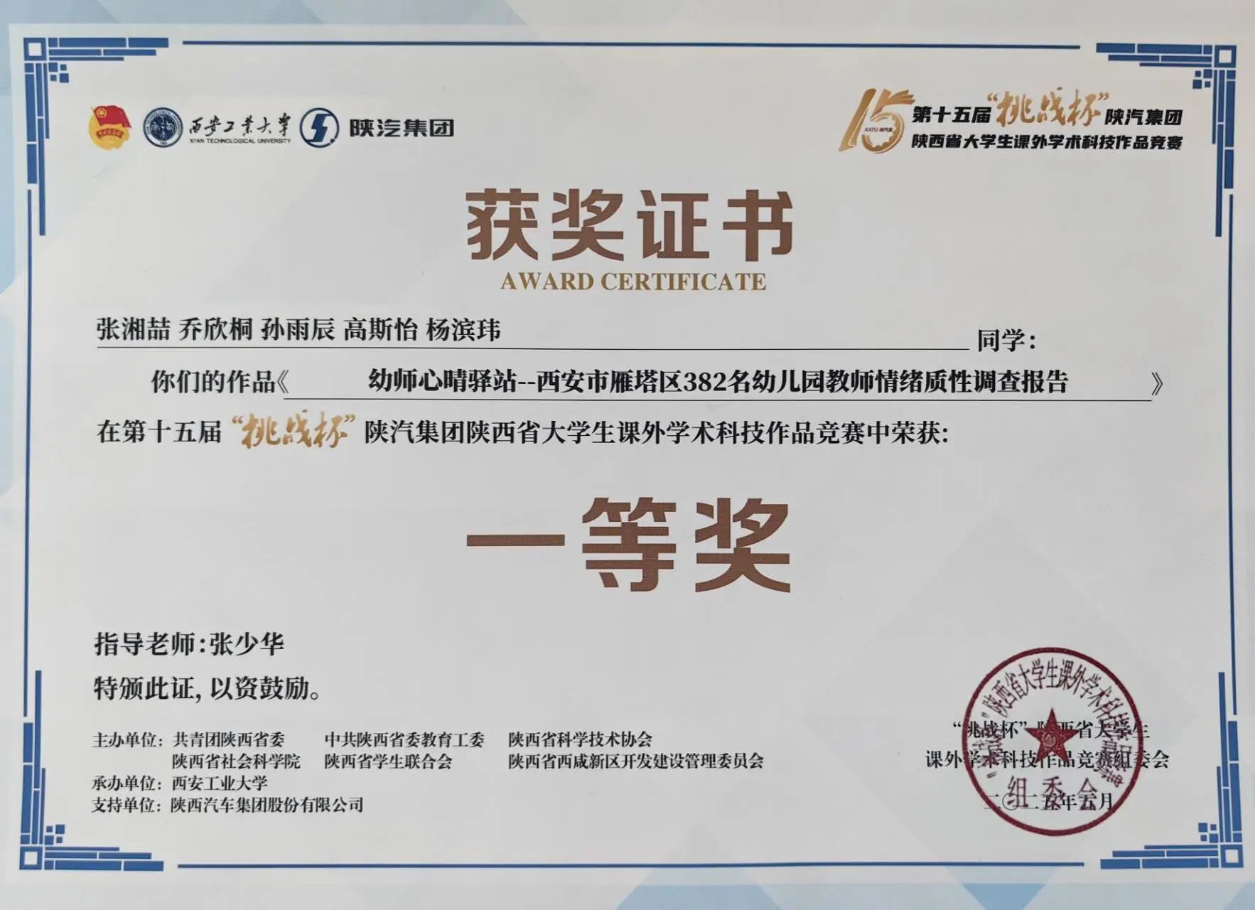 5月24日,由共青团陕西省委、陕西省委教育工委、陕西省科学技术协会等联合主办的第十五届“挑战杯”陕汽集团陕西省老员工课外学术科技作品竞赛在西安工业大学圆满落幕。本届赛事吸引了全省86所高校共991件作品参与角逐,经多轮评审,最终393件作品入围终审决赛。在公司张少华教授的精心指导下,由张湘喆、乔欣桐、孙雨辰、高斯怡、杨滨玮五位同学完成的《幼师心晴驿站——西安市雁塔区382名幼儿园教师情绪质性调查报告》项目荣获第十五届“挑战杯”陕西省老员工课外学术科技作品竞赛省级一等奖!实现了公司在该项赛事省级一等奖零的突破!