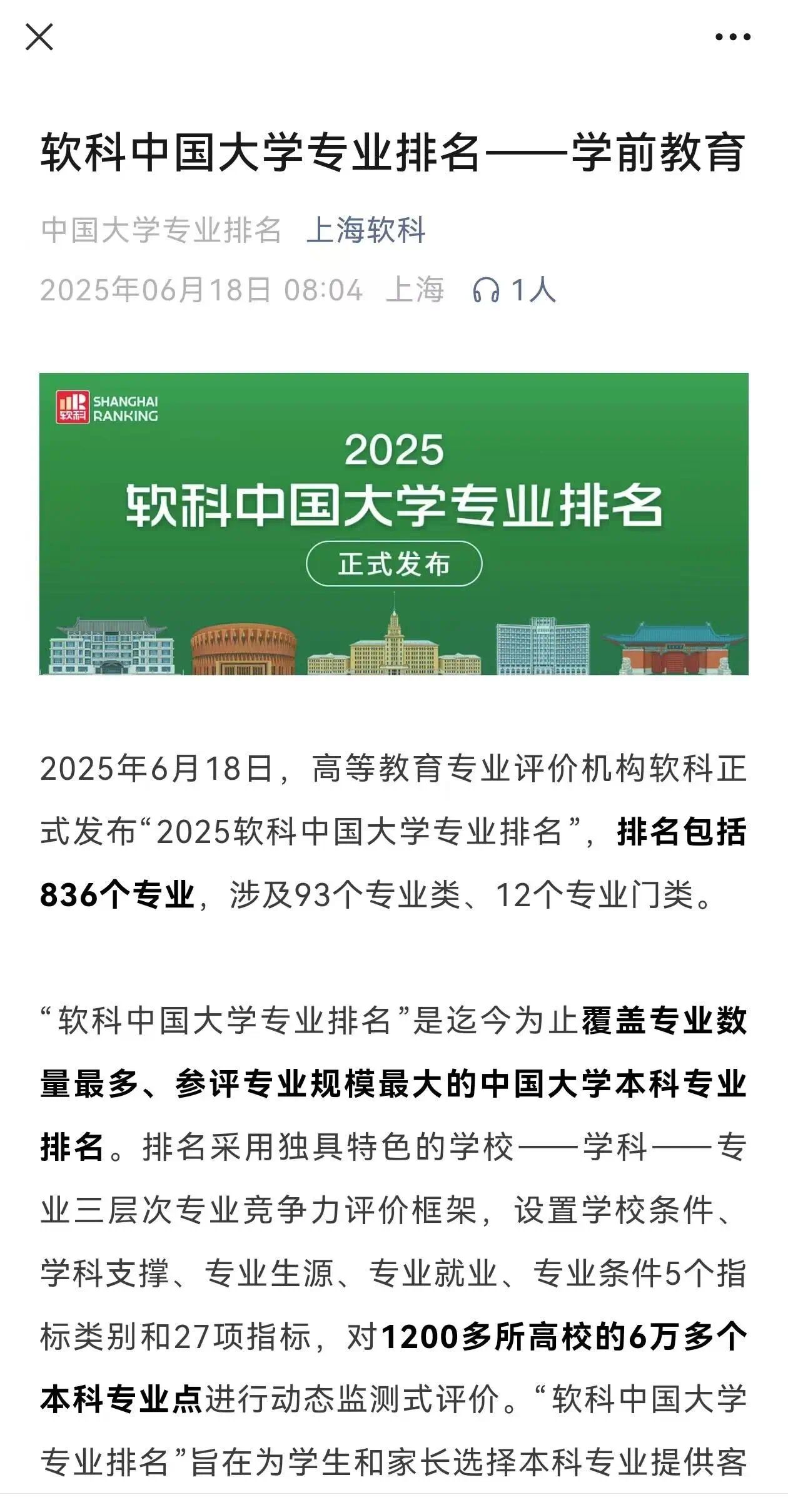“软科中国大学专业排名”是迄今为止覆盖专业数量最多、参评专业规模最大的中国大学本科专业排名。本次排名中学前教育专业排名持续攀升,全面彰显了公司在学科专业建设、人才培养质量以及教学科研成果等方面所取得的显著进展,凸显出公司整体办学水平的稳步跃升。
