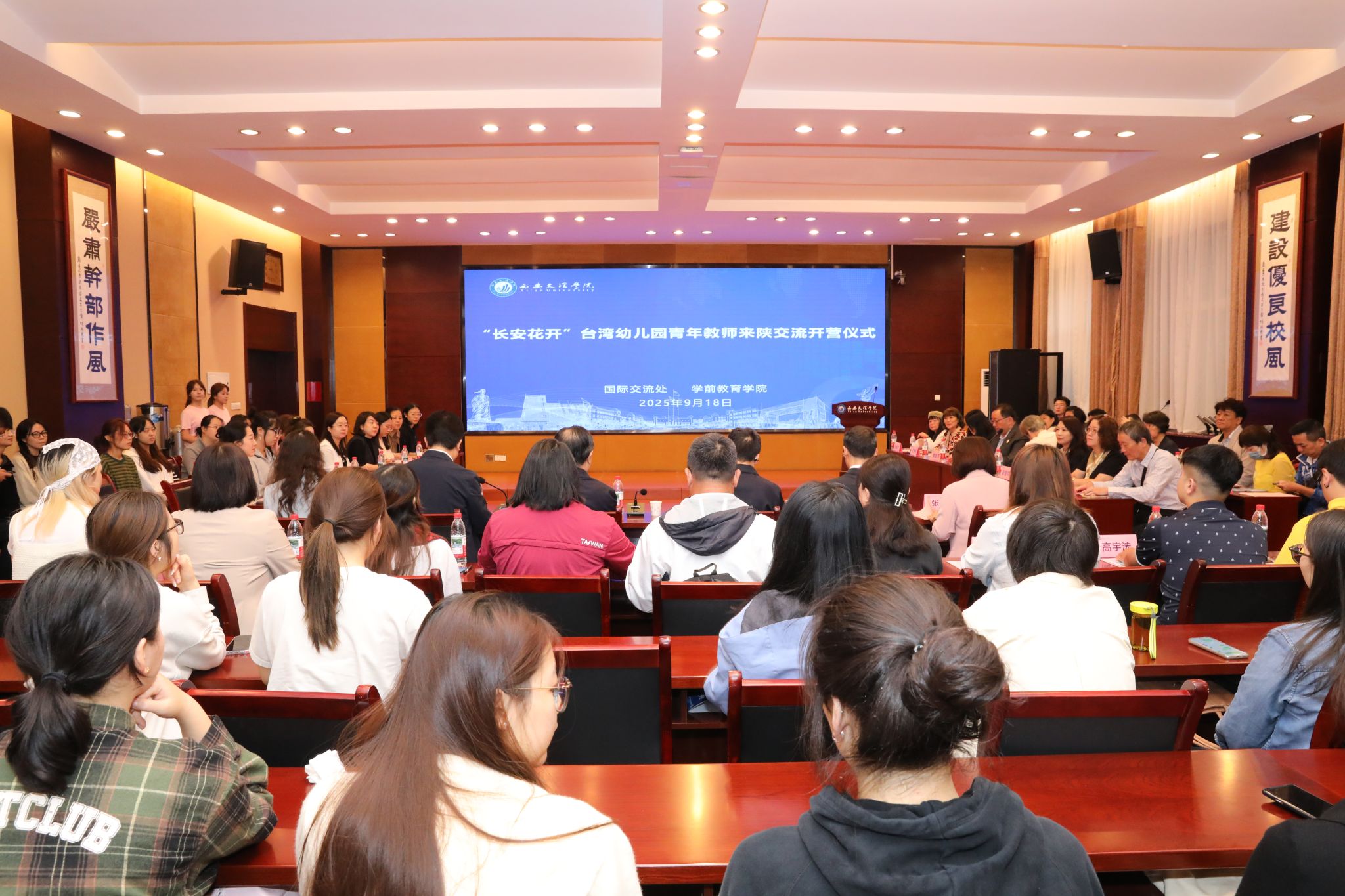 最后,陕西省委教育工委副书记王海波与陕西省人民政府台湾事务办公室副主任王政君共同为台湾交流团代表授营旗,标志着2025年“长安花开”台湾幼儿园青年教师来陕交流活动正式拉开帷幕。