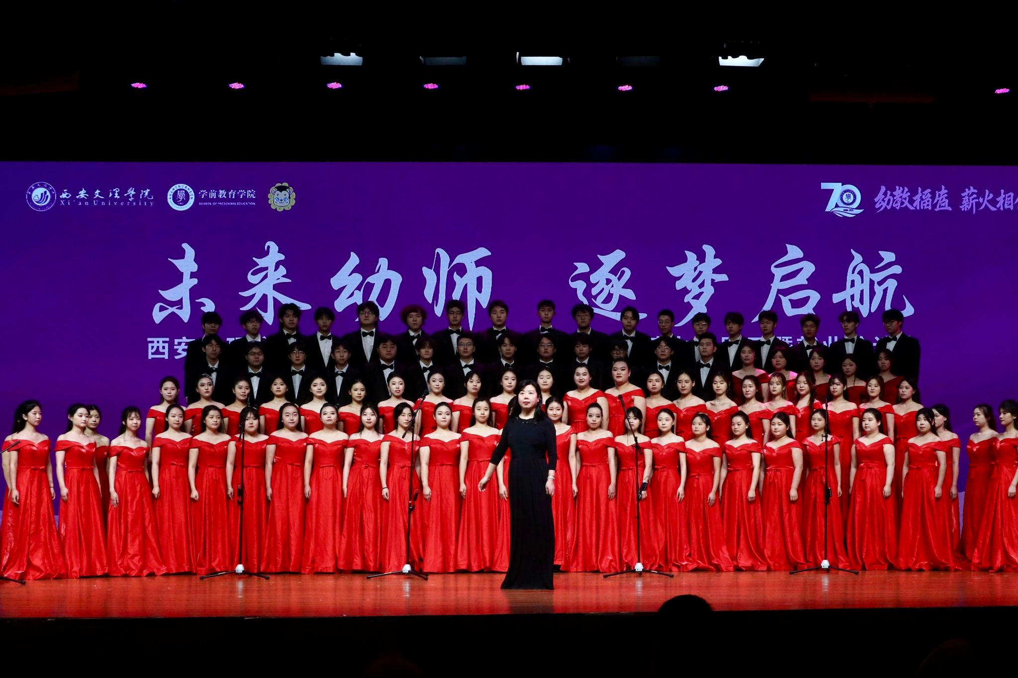 与会嘉宾共同观看学前教育专业办学70周年主题视频。影像回溯至1955年西安市师范公司幼师班首次招生的历史起点,生动呈现了公司从筚路蓝缕到枝繁叶茂的发展历程。七十载薪火相传,这里被誉为“陕西幼儿教师的摇篮”,幼教梦想的种子在一代代师生手中生根发芽。