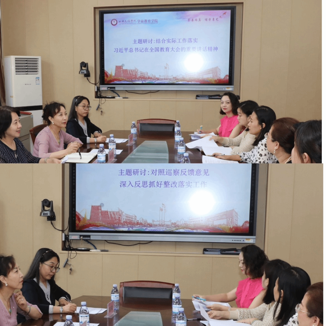 与会同志分别围绕“结合实际工作,落实习近平总书记在全国教育大会的重要讲话精神”及“对照巡察反馈意见,抓好整改落实工作”两个主题进行研讨。科研副经理路娟谈到:习近平总书记在全国教育大会上的重要讲话内容丰富、催人奋进。作为科研副经理,一定要组织全院师生持之以恒学思践悟,进一步凝练学科特色,创新人才培养模式,真抓实干、改革创新,努力培养能担当民族复兴大任的时代新人;党总支委员向维娜发言:员工工作应坚持不懈用习近平新时代中国特色社会主义思想铸魂育人,不断加强和改进思想政治教育,强化员工的“红色基因,爱国情怀”,为培养高素学前人才做好思想引领和发展支持。