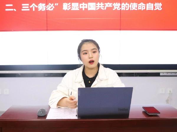 宣讲人陈卓以“深学笃行二十大,百年筑梦正青春”为主题展开宣讲。紧扣二十大报告原文,分别从党的二十大主题具体内涵、深刻领悟“三个务必”、中国共产党精神谱系——大别山精神、习近平总书记寄语青年四个方面展开,进行了深入解读。党的二十大是我们党的历史上一次极为重要的大会,全面准确学习领会党的二十大精神,对于所有人而言,既是当前和今后一个时期的首要政治任务,更是青年人树立远大理想、明确奋斗目标,清晰成长路径、激发前进动力的重要方式。“三个务必”伟大号召,更是是走好新的赶考之路的政治动员,而对于所有青年一代而言,“三个务必”也是对青年一代更高标准的政治要求。同时,她结合视频资料、自身的学习、实践和成长经历,勉励同学们作为新时代青年要身有闯劲、行有锐意,不畏艰难、勇于攀登,在学习、生活、工作中能努力将小我成长融入到大我奋斗之中来,展现青春风采,成为更好的自己。在实现个人理想的同时为实现第二个百年奋斗目标贡献自己的青春力量。