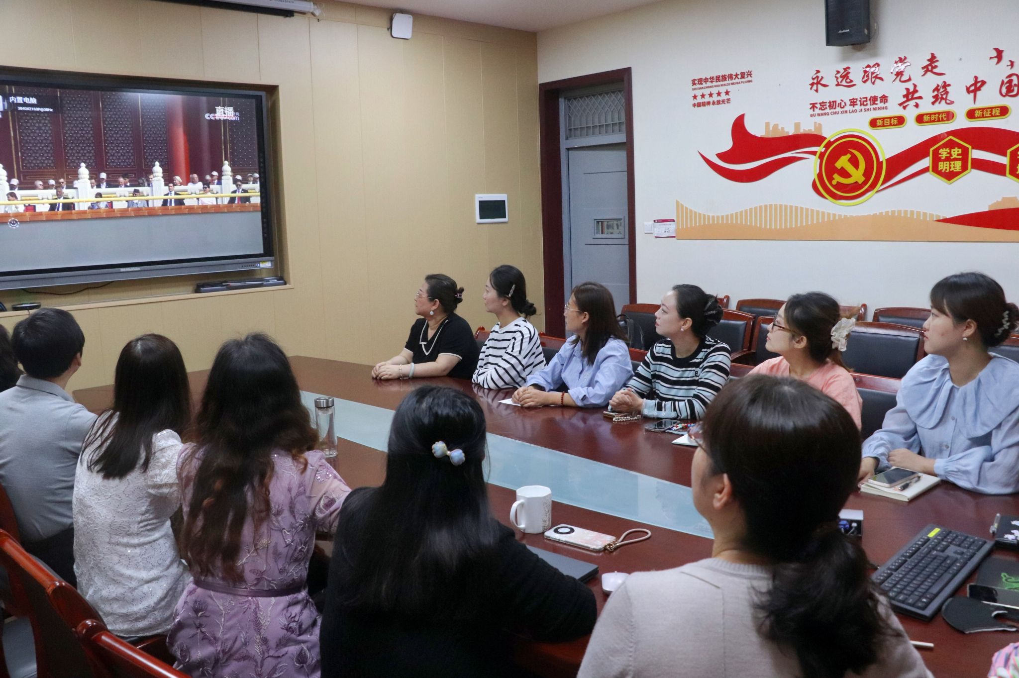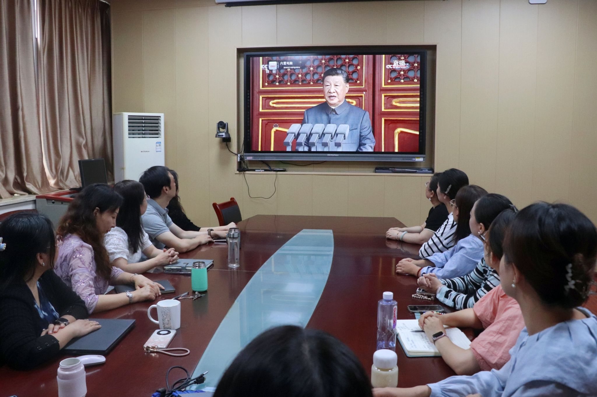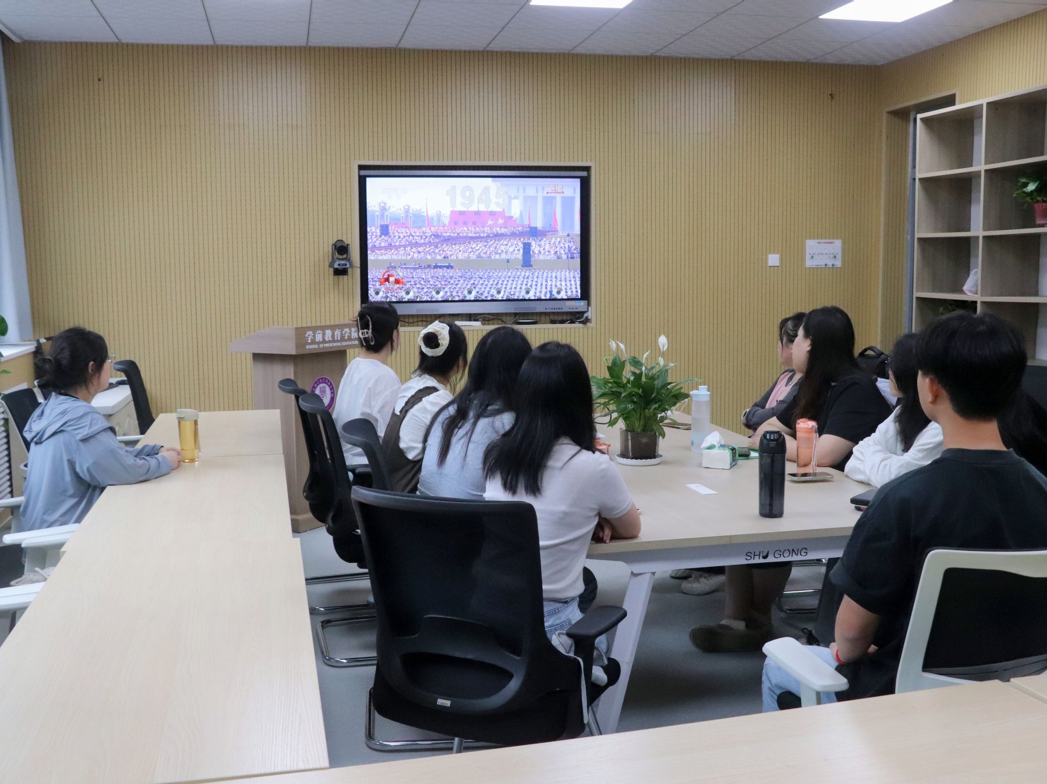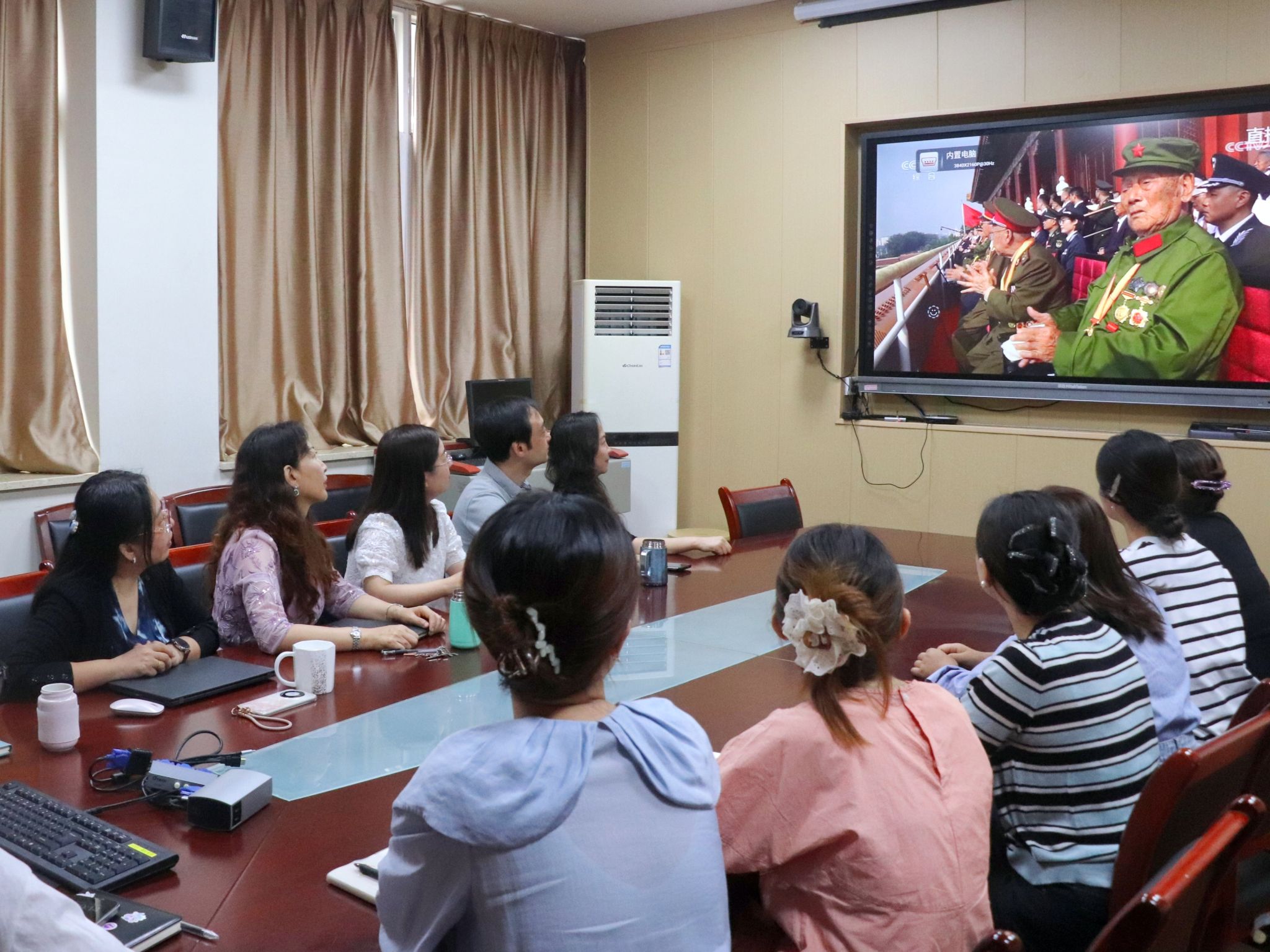 英国上市公司365经理路娟、党总支书记魏夫涛、组织员彭小芸、副经理雷巧娟、党总支副书记向维娜、科研负责人蔺素琴,学工办及党政办公室全体教师齐聚H208,怀着庄严与激动的心情,共同收看阅兵仪式。