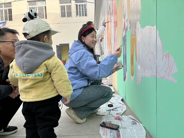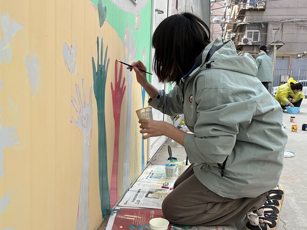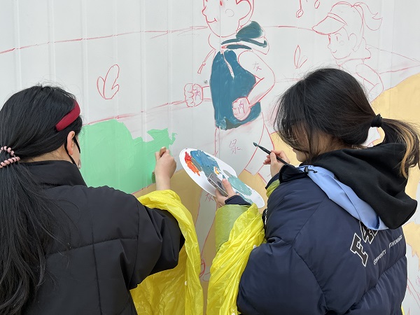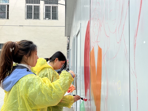 挥动公益笔墨,发扬奉献精神。志愿者们笔不停歇,将自己的专业奉献精神融入墙绘之中。从确定墙绘位置、尺幅,到构图上色、调整细节、绘制边框,再到添加文字标语、刷墙漆,志愿者们分工明确,团结一致。她们手拿刷子、滚筒等工具,调颜料、勾轮廓、涂色彩,默契配合,互帮互助,齐心共筑墙绘艺术。反复打磨每一处墙绘,认真勾勒每一个细节,经过数小时的不懈努力,将原本空白的墙面变成了一幅幅色彩缤纷、寓意深刻的画卷。