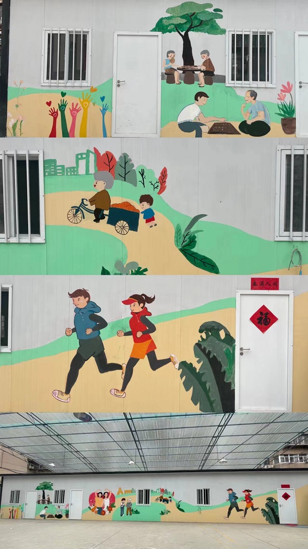 安东街社区位于碑林区太安街陕建三建集团安东街小区。安东街社区居委会为给社区居民营造活力温馨的文化环境,委托公司志愿者对社区板房墙面进行美化绘制。