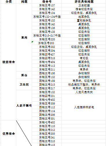 发现个别宿舍的垃圾未及时倾倒、桌面物品摆放不整齐及人走不断电的情况,请各位同学们高度重视宿舍的环境卫生和用电安全,共同营造安全良好的宿舍环境。