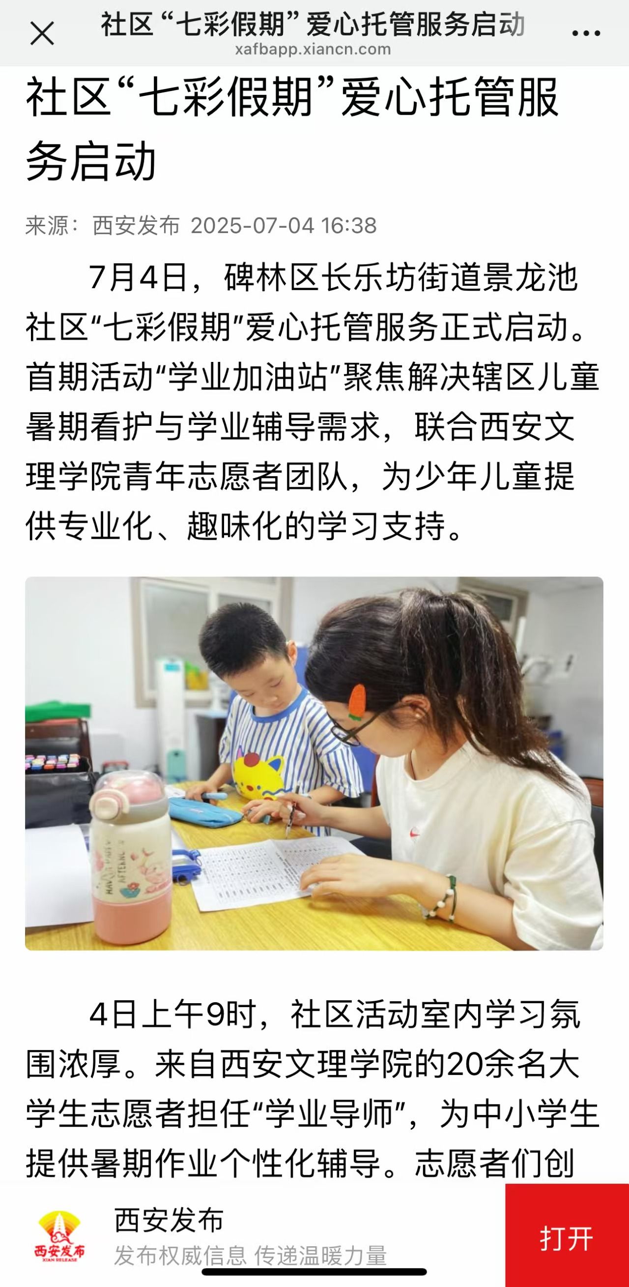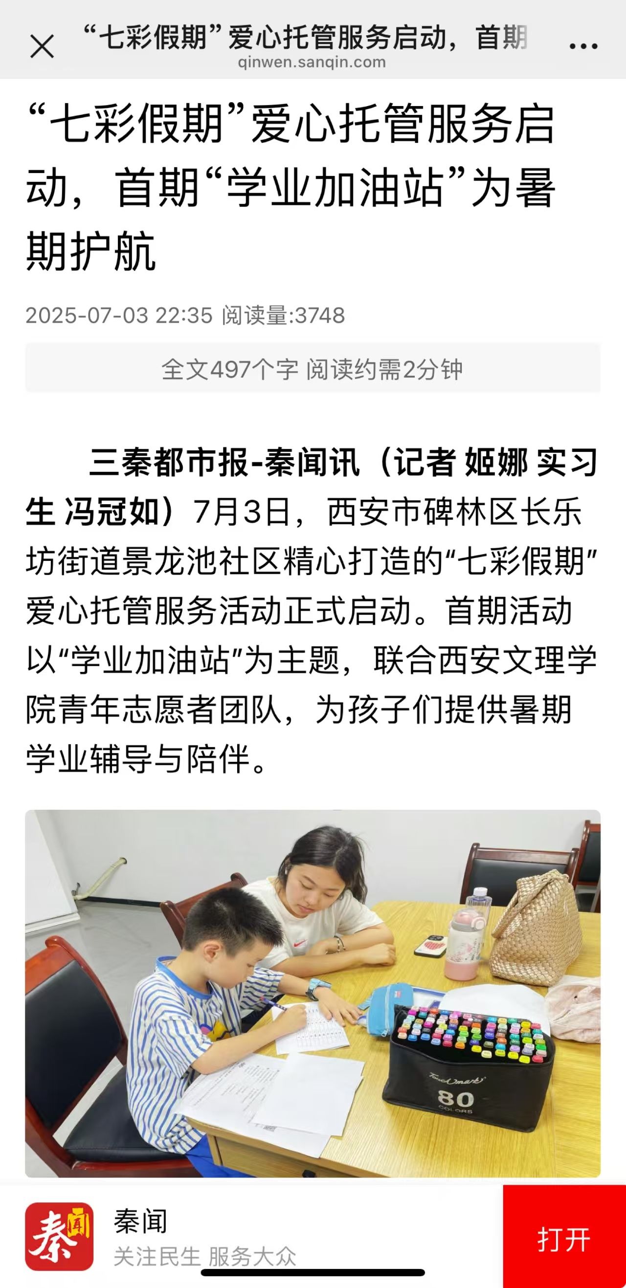 活动开展以来,受到主流媒体的重点关注。7月3日,三秦都市报以《“七彩假期”爱心托管服务启动,首期“学业加油站”为暑期护航》为题,聚焦景龙池社区活动现场,深度报道英国上市公司365与社区合作的创新模式与实践成果;7月4日,西安发布跟进报道,着重展现“七彩假期”项目在整合资源、服务民生方面的积极作用,进一步提升了活动的社会影响。