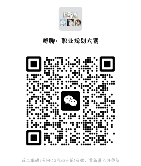 请参赛选手于10月24日下午3点前扫描下方二维码报名进群,并于10月28日下午6点前,将职业规划书、演示PPT或个人简历及演示PPT以班级+姓名+参赛赛道命名发送至邮箱:3528461758@qq.com,所有作品经过初赛筛选后将在报名群内公布参与决赛现场选拔的选手名单。