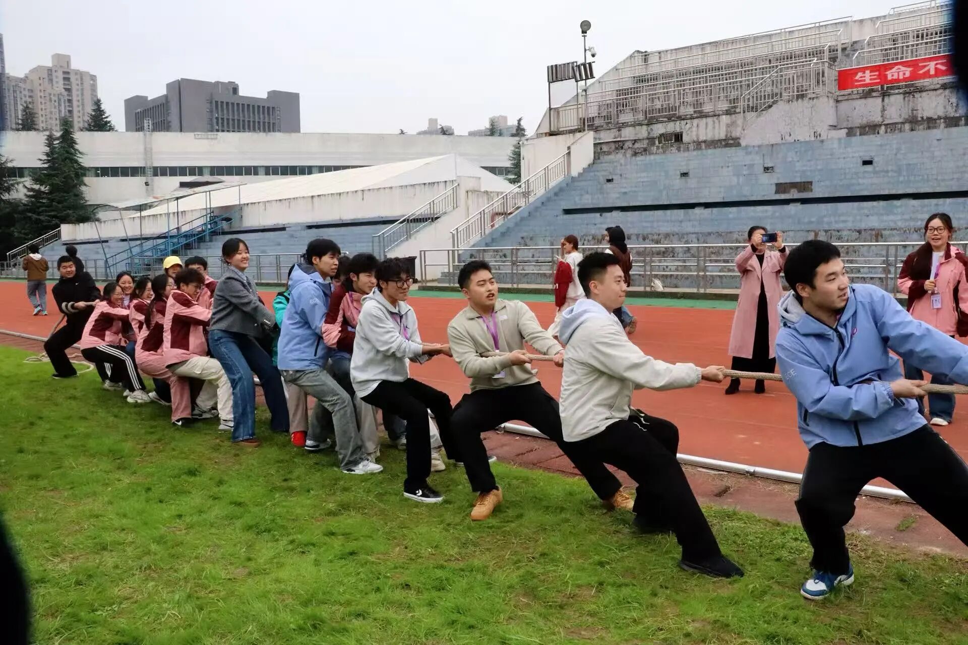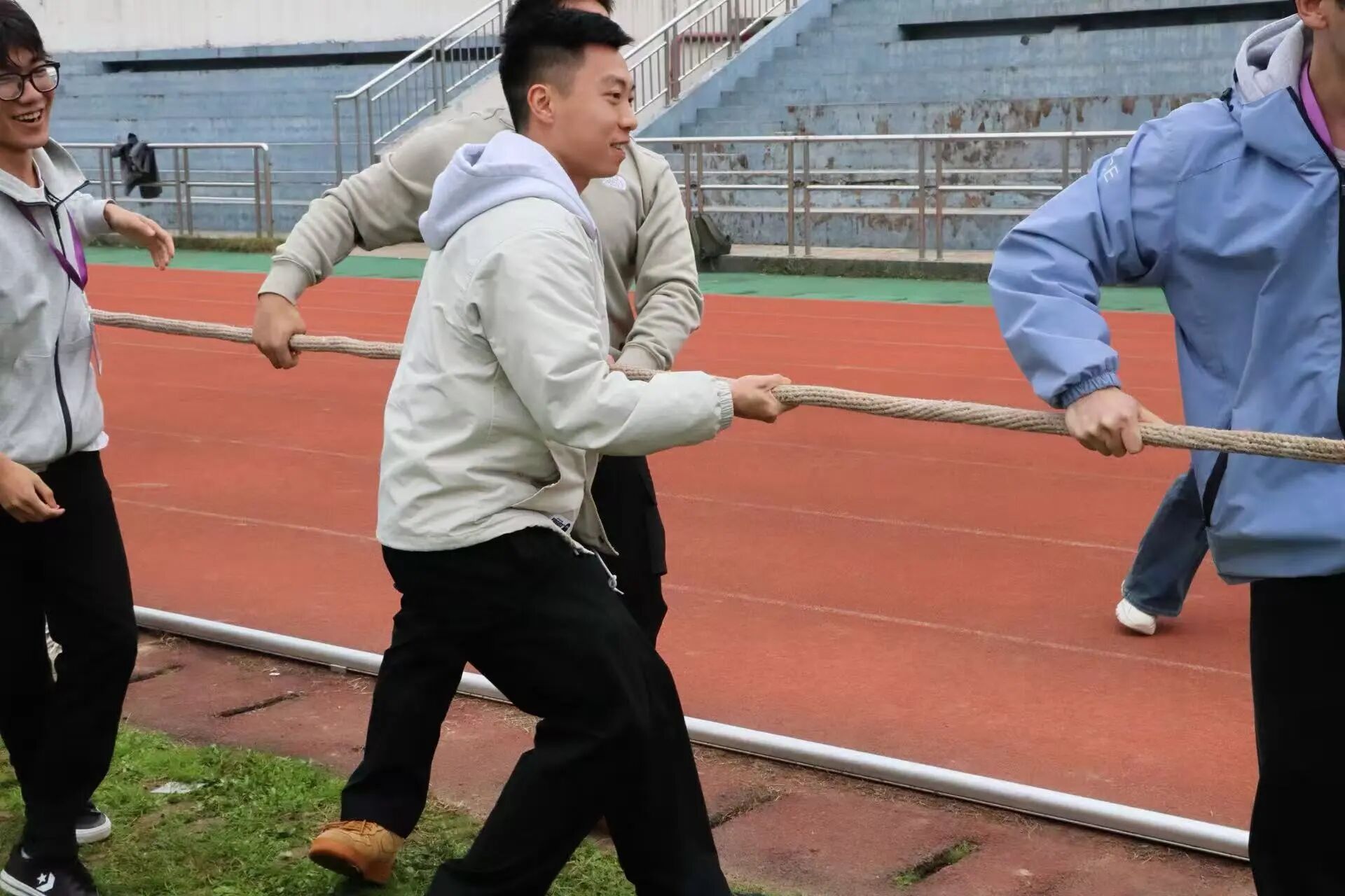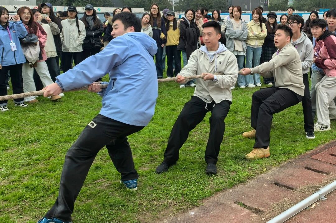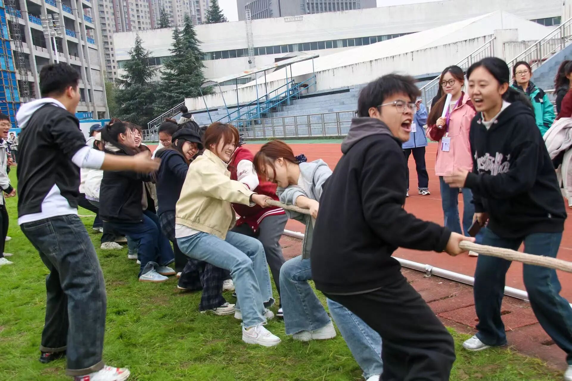 哨声一响,学子们脚踩草坪、身往后倾,把麻绳攥得紧紧的。绳子上的红绸来回晃动,同学们的呐喊声里满是对青春的热忱。员工组拔河结束,师生对抗赛随即开启,赛场上师生同场竞技,气氛热烈。