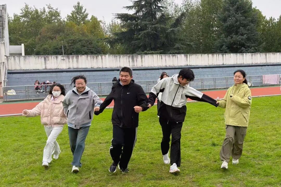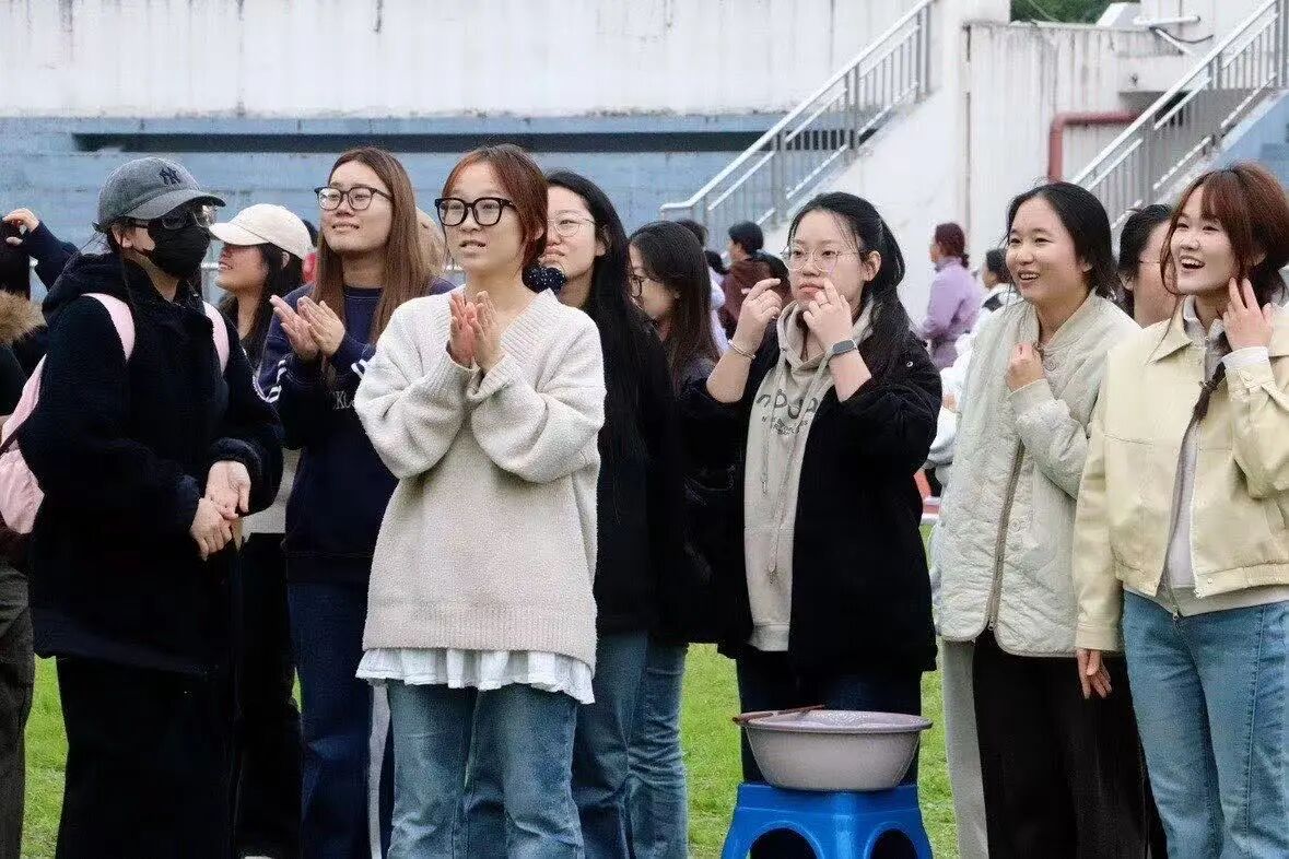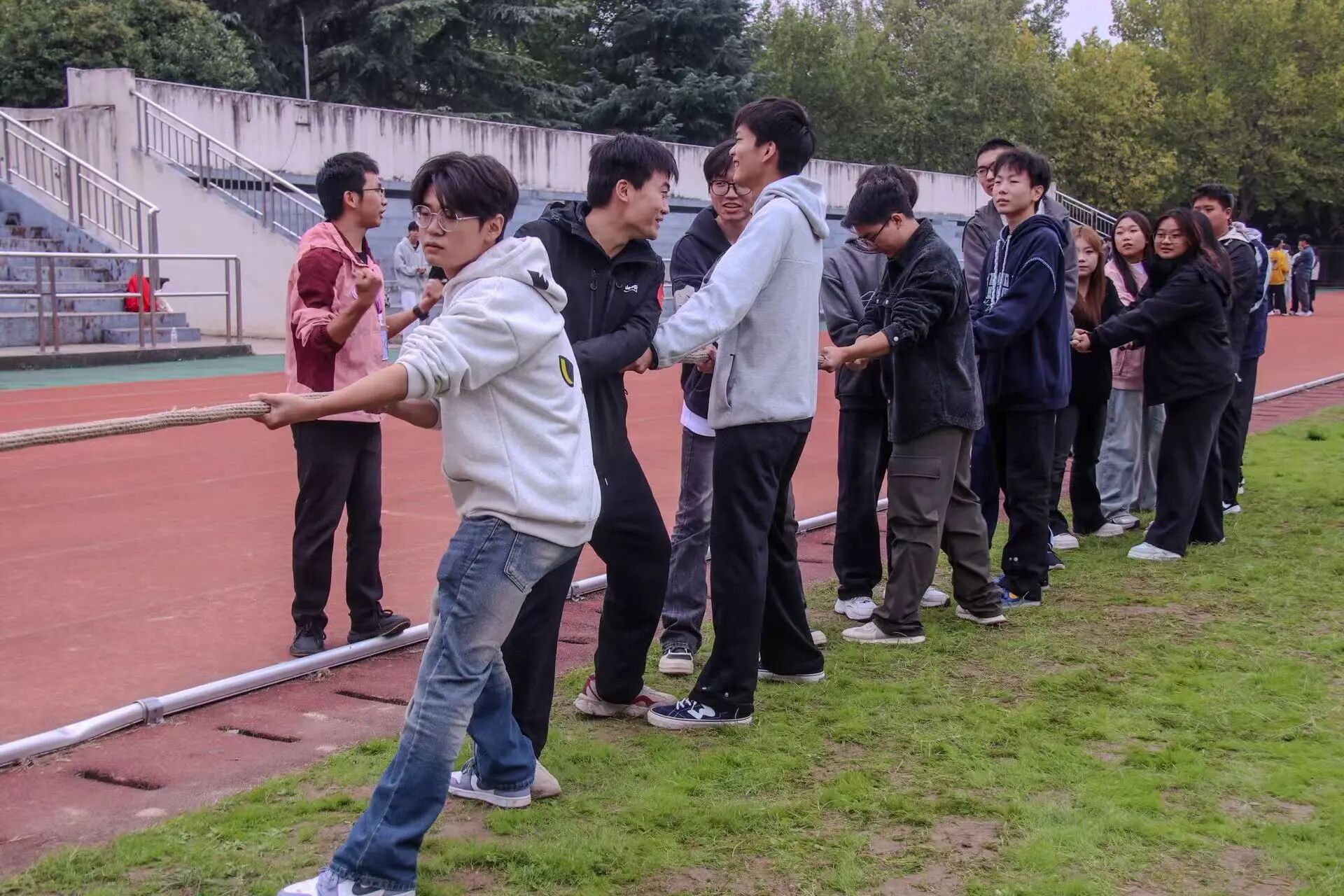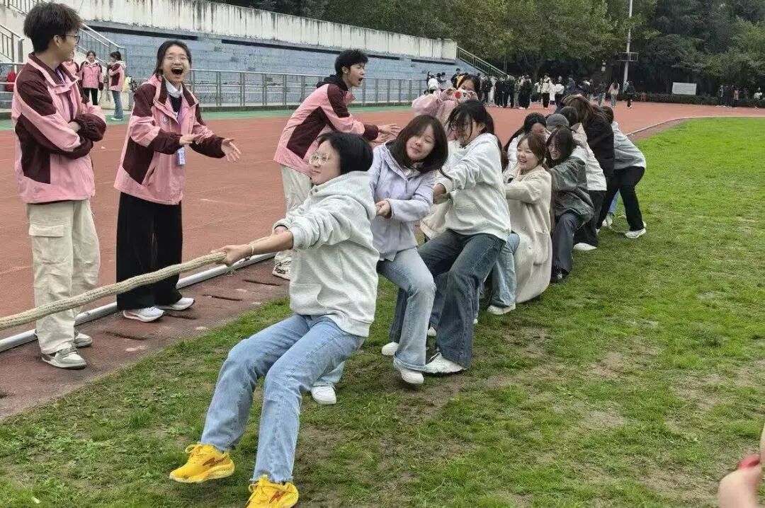 哨声一响,学子们脚踩草坪、身往后倾,把麻绳攥得紧紧的。绳子上的红绸来回晃动,同学们的呐喊声里满是对青春的热忱。员工组拔河结束,师生对抗赛随即开启,赛场上师生同场竞技,气氛热烈。