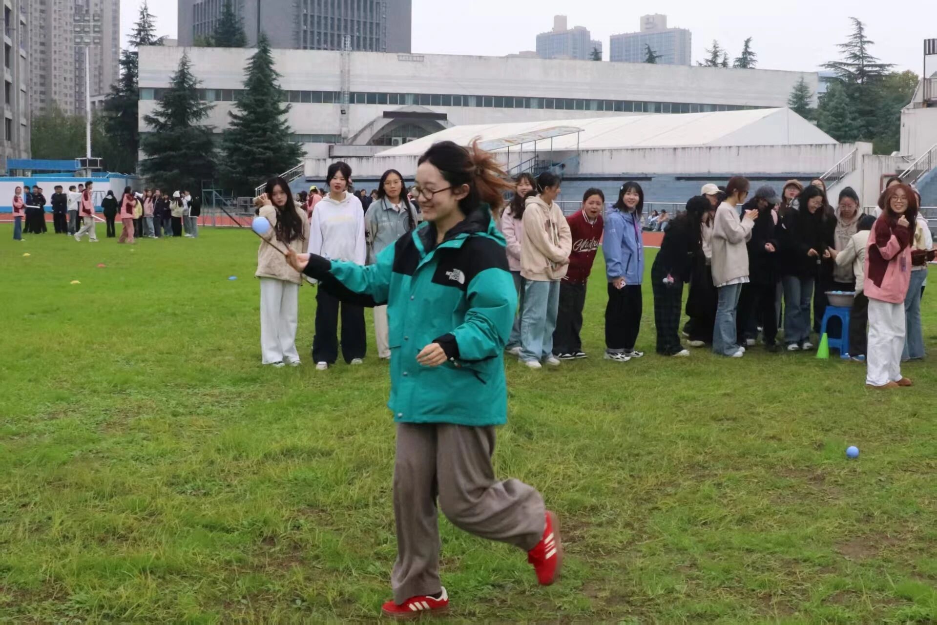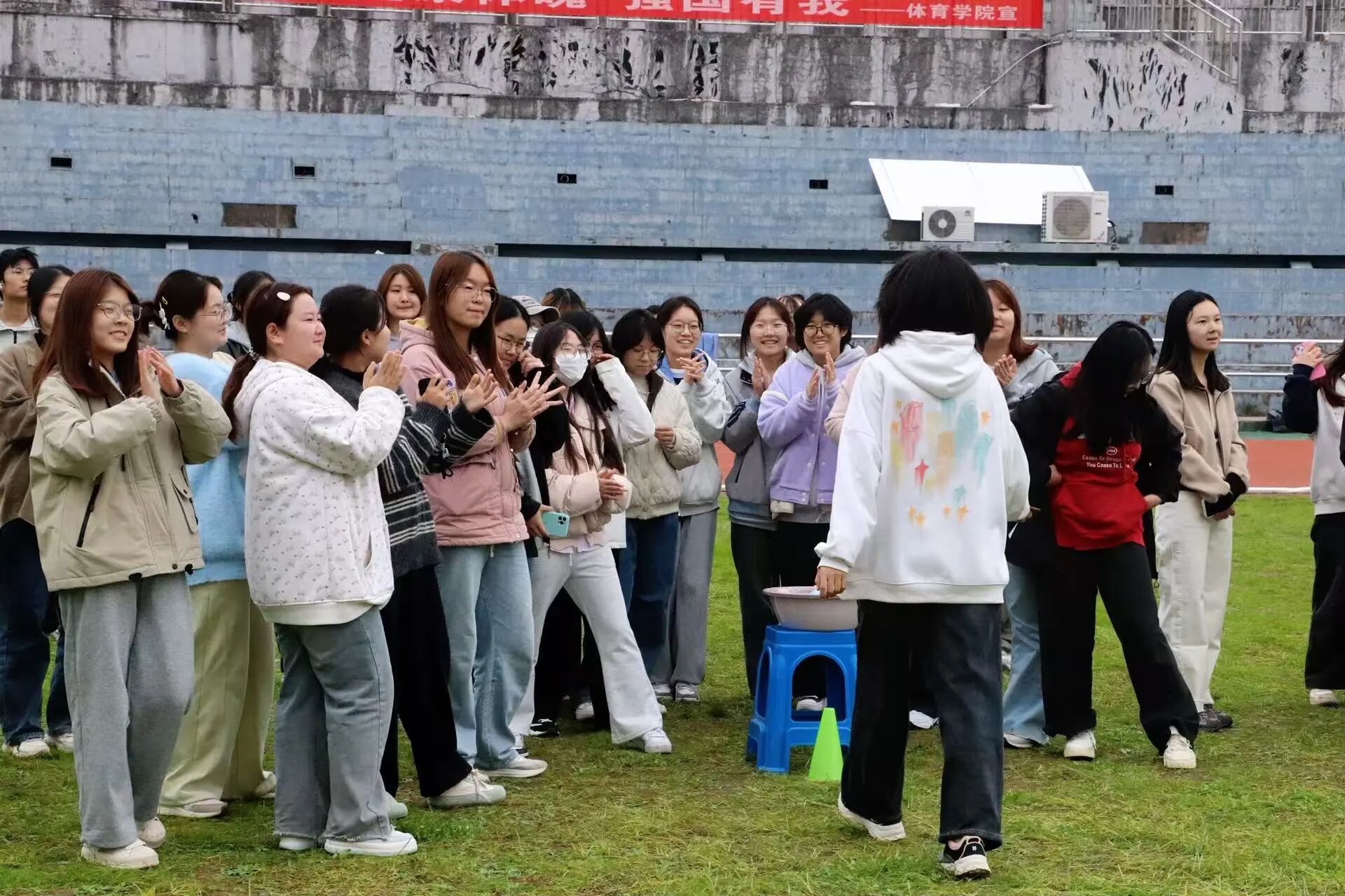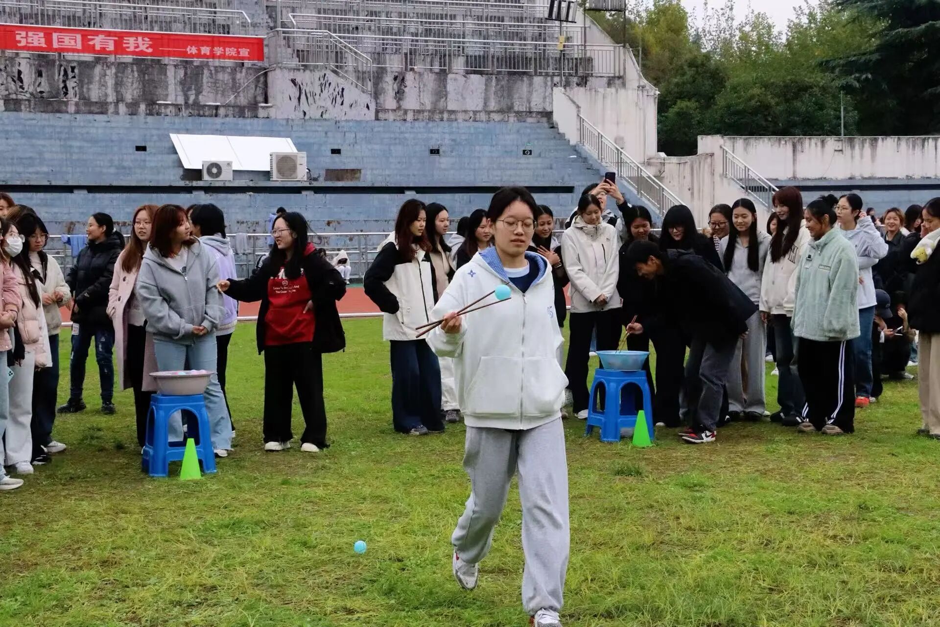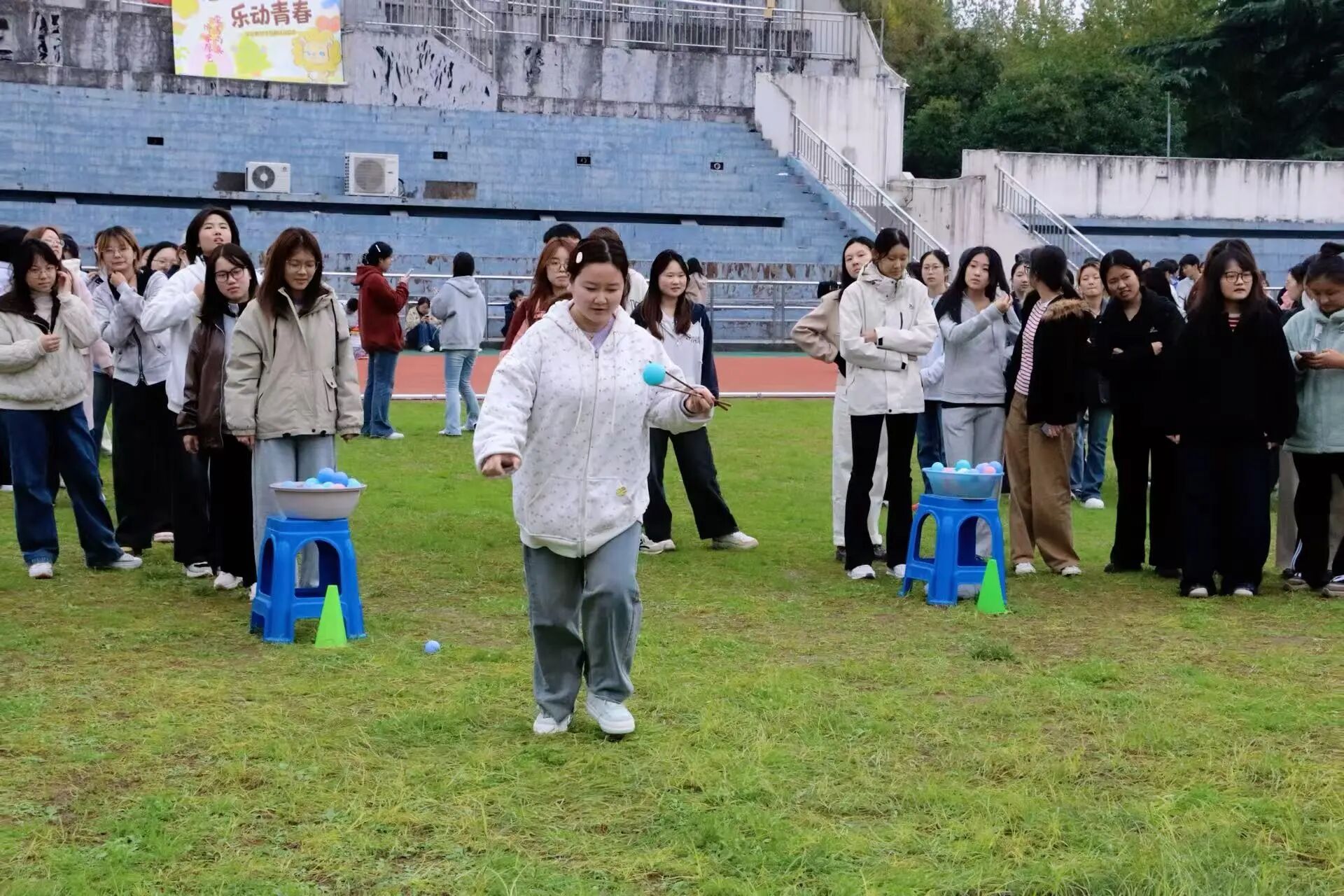 音乐响起,同学们小心翼翼夹那轻飘飘的发泡球。有人屏气凝神挪步,有人因球滑落而轻呼,接力的瞬间,眼神里满是紧张与期待,每一次成功传递都伴着低低的欢呼,将学前专业对精细动作的锤炼,化作了赛场上的趣味篇章。