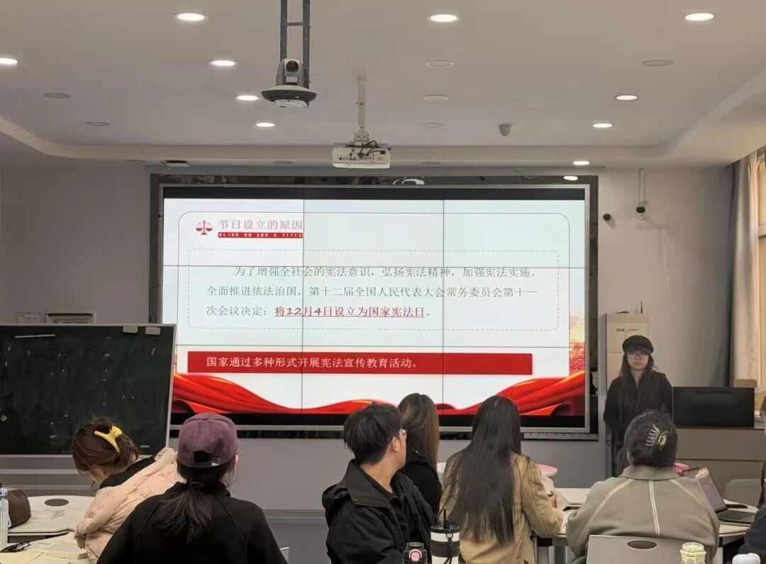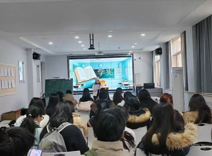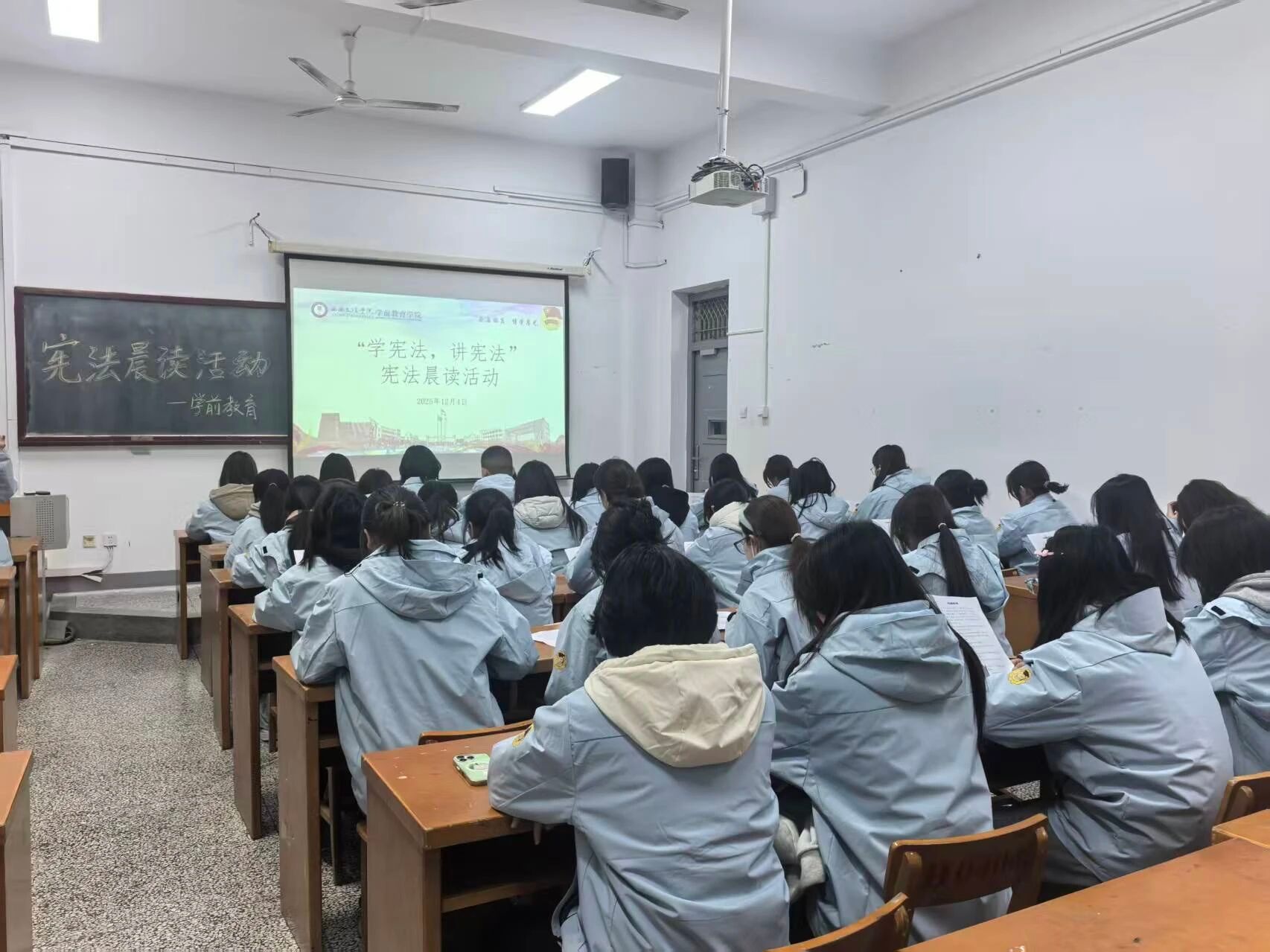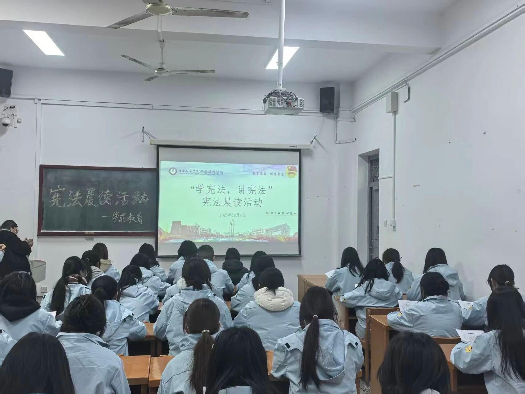 晨光中,全体2025级新生齐聚班级,开展“晨读悟宪”活动。同学们手持宪法节选读本,齐声诵读公民基本权利与义务、国家机构等核心条文,朗朗书声传递着对宪法的尊崇。诵读后,员工代表结合专业发言:“作为未来的幼师,我们不仅要自身懂法守法,更要把宪法精神转化为幼儿能理解的语言,在日常教学中播撒法治种子。”沉浸式体验让宪法条文从文字转化为内心认同,更明晰了法治启蒙教育的职业使命。