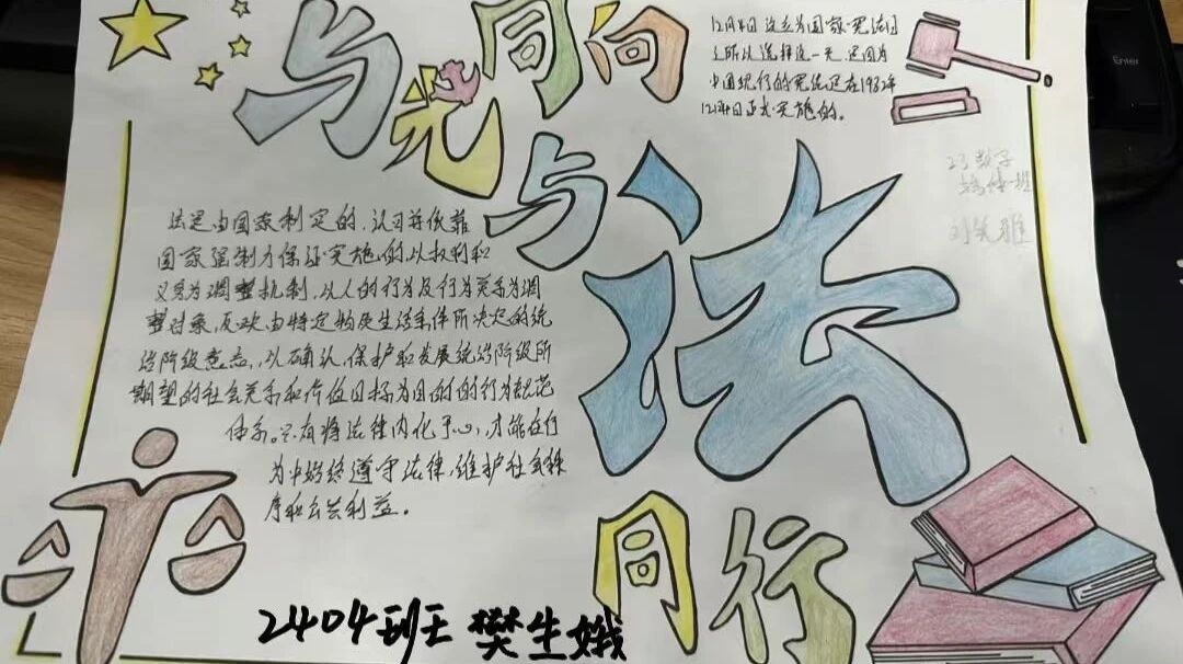 依托专业美术素养,公司发起“绘法筑梦”手抄报创作活动。同学们以“宪法+幼儿教育”为主线,将抽象法条转化为童趣作品:有的绘制“宪法保护幼儿成长”连环画,有的用卡通形象诠释“平等、公正”价值观,还有的设计“幼儿法治启蒙绘本节选”,让手抄报成为可直接用于教学的微型教材。优秀作品在校园展示,既展现了专业技能,更让宪法精神以直观形式浸润校园。