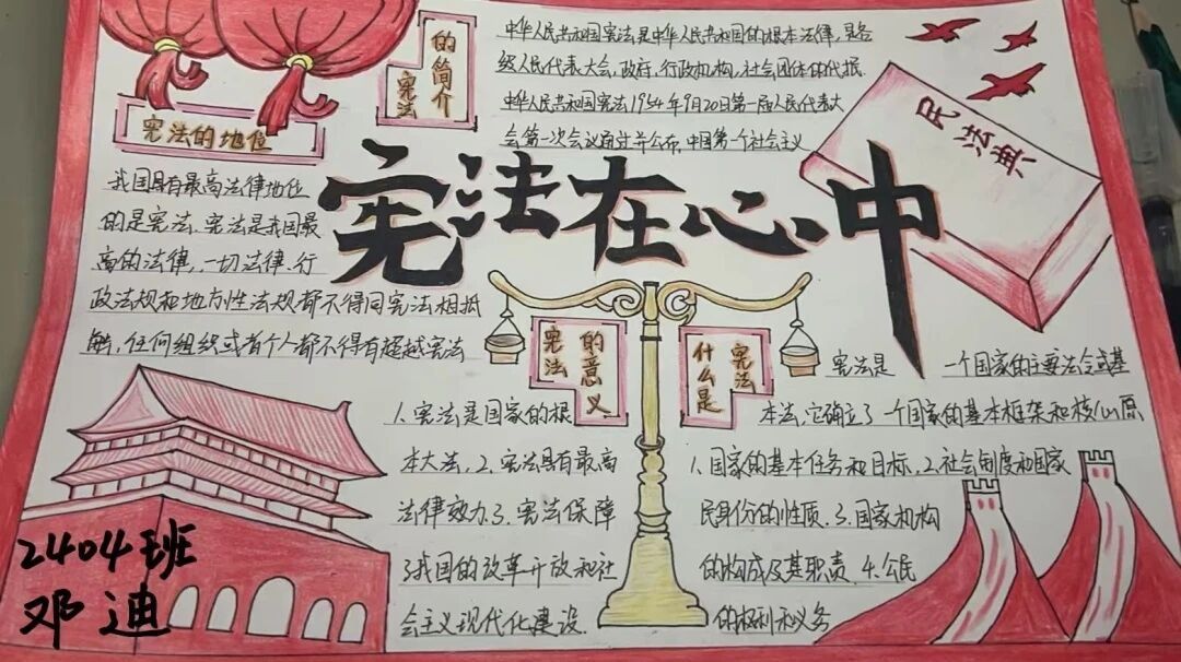 宪法是治国安邦的总章程,更是未来幼师践行职业使命的根本遵循。为让宪法精神深度融入校园生活与专业成长,公司以“宪韵润心,法伴幼行”为主题,聚焦主题班会、集体晨读、手抄报创作及心得分享四大核心环节,通过互动式、沉浸式、特色化的教育形式,让宪法知识与专业实践深度融合,引导同学们在参与中体悟法治内涵,明确未来幼师的责任与担当。