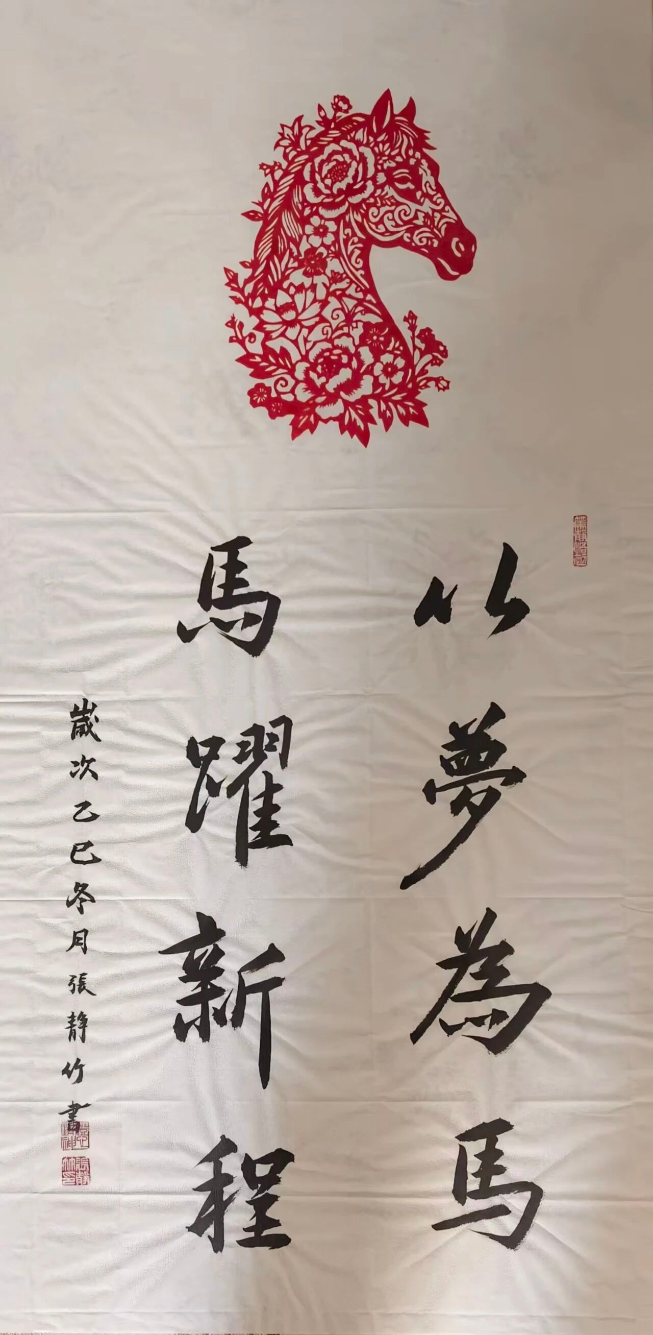 本作品紧扣“骏启新程,文韵贺岁”主题,以2026马年为核心意象,融合剪纸非遗与书法艺术,诠释辞旧迎新的文化内涵。“以梦为马,马跃新程”的行书题字,既以“骏”之跃动喻新程开启的进取之势,又以“梦”为引,赋予传统生肖主题当代逐梦精神;顶部红剪纸马头缀以花卉纹,既承载“马到成功”的贺岁祈愿,更彰显传统工艺的文韵之美。