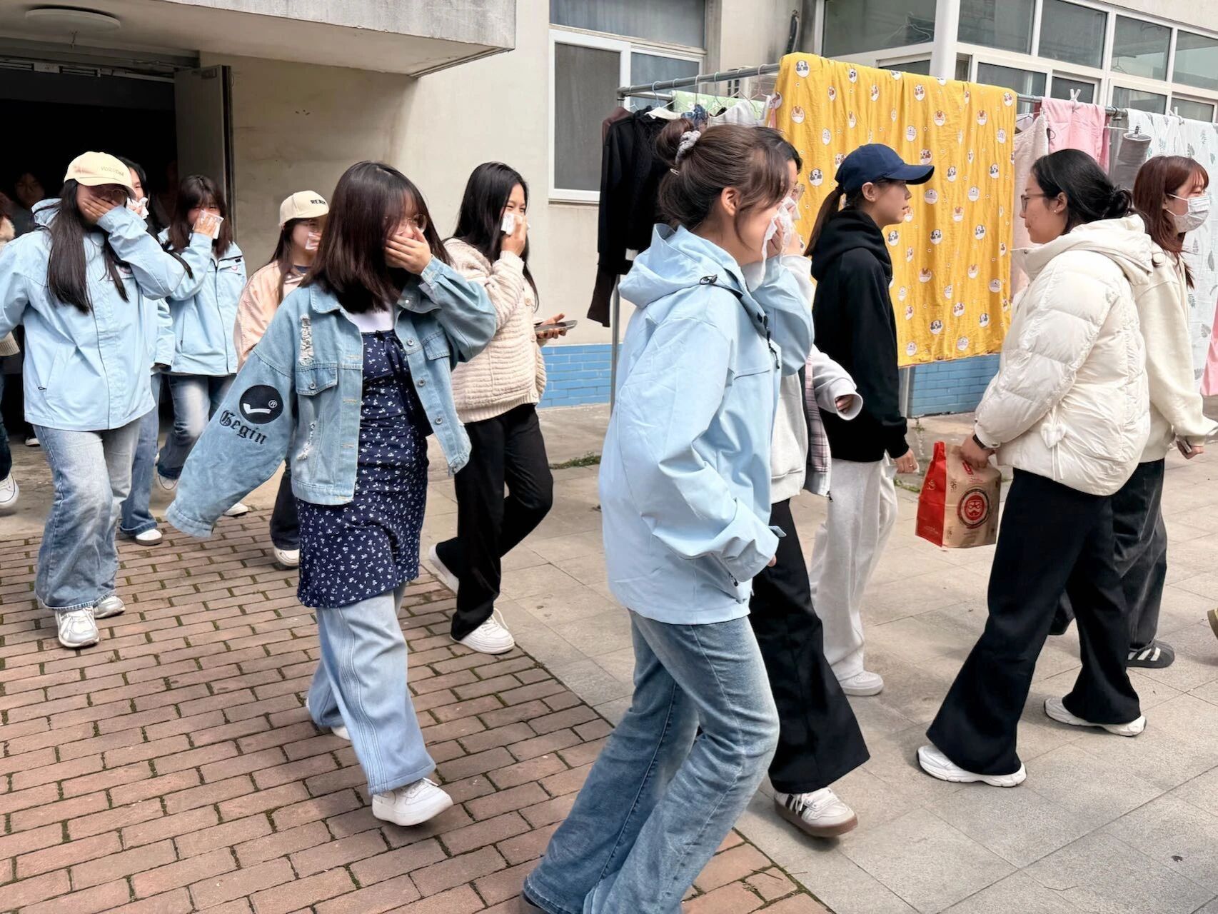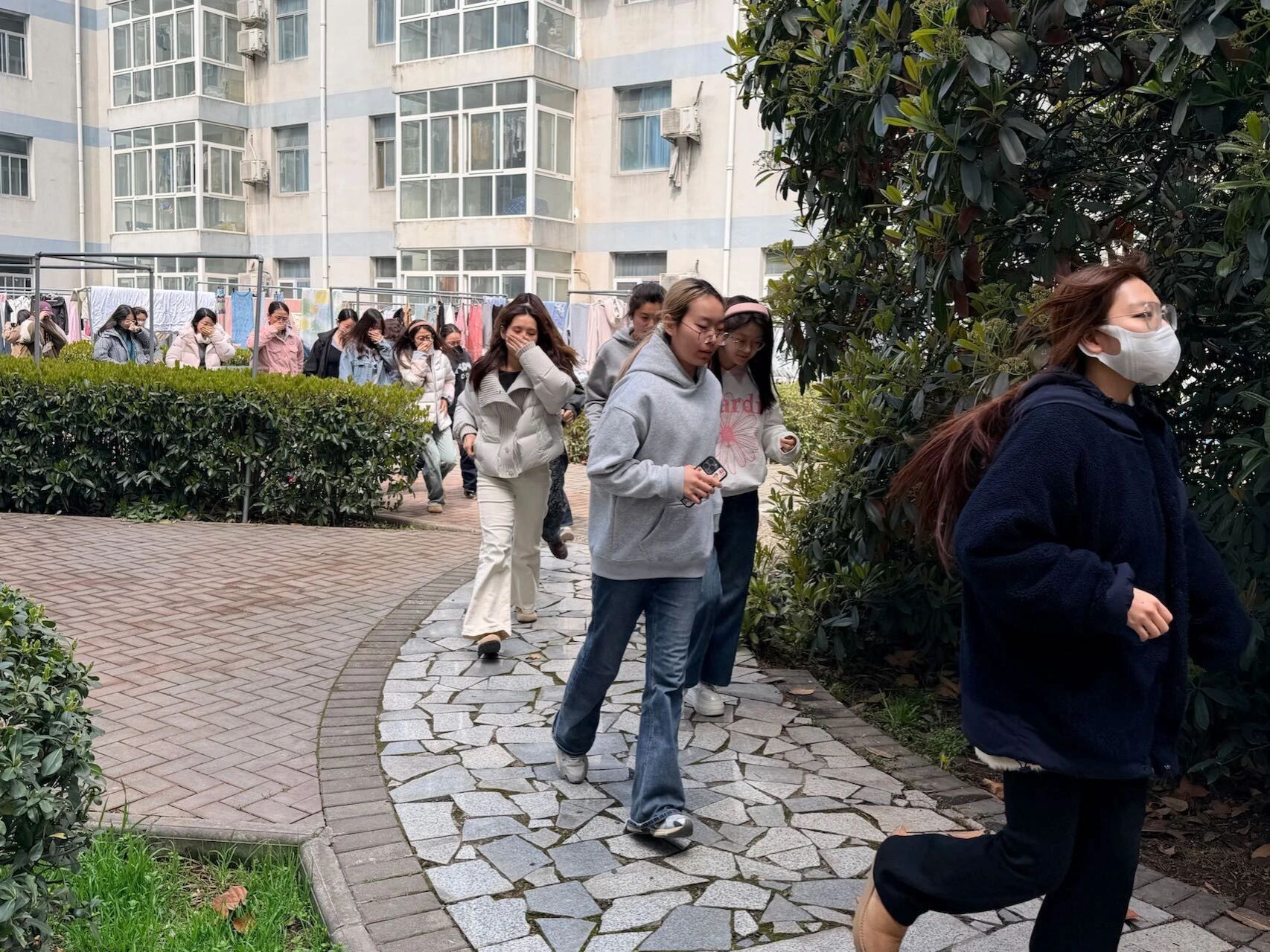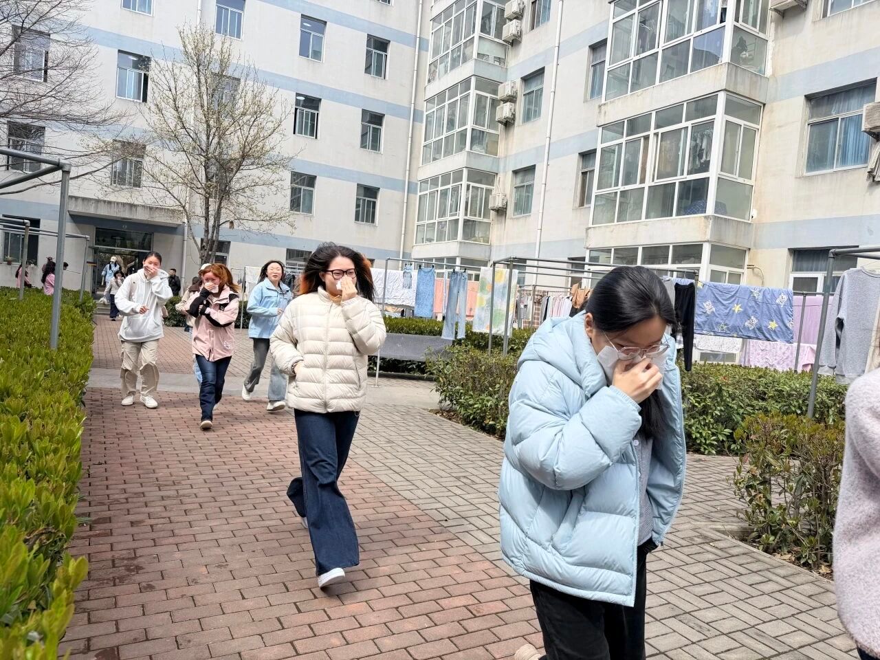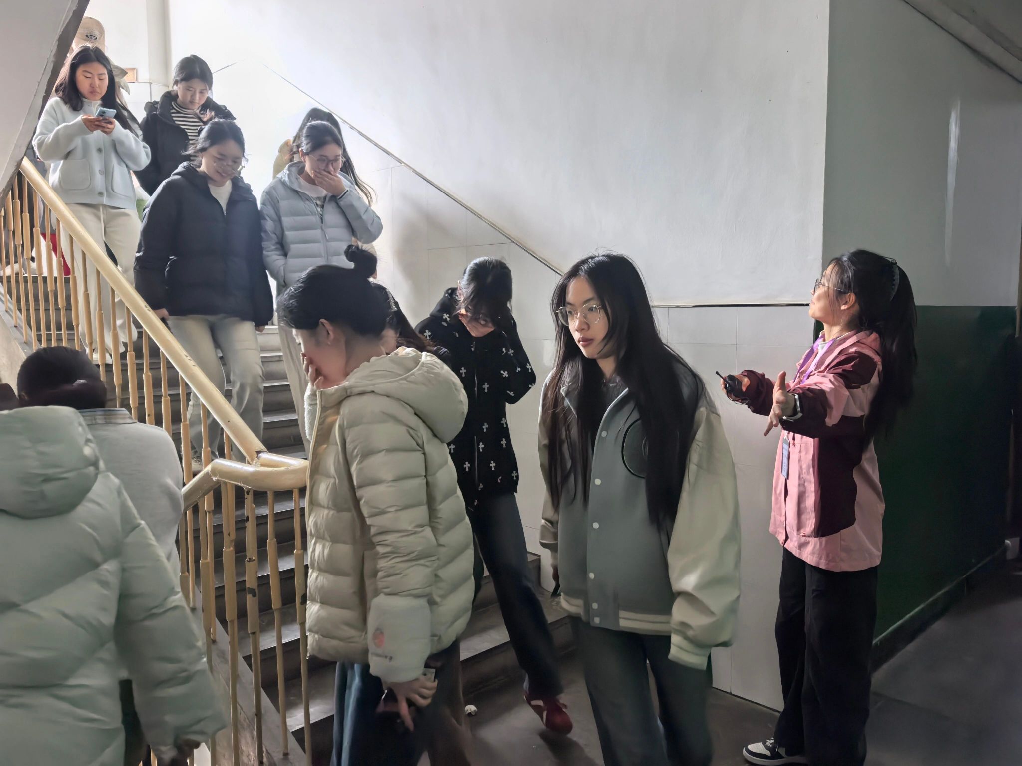 警报声响起后,同学们反应迅速、沉着冷静,严格按照指定疏散路线有序撤离,分别经由南侧、北侧楼道快速疏散至安全区域集合。整场演练组织周密、行动高效,最终达到了预期的演练效果。