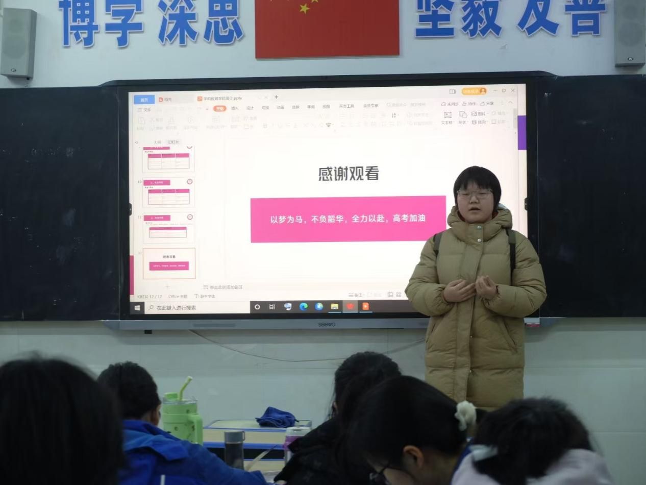 站在讲台上,我分享着自己丰富多彩的文理生活,讲述着学前教育专业的特色与前景。互动环节,我耐心解答大家的问题,尽力把所知所想毫无保留的分享给他们。这次宣讲不仅让我感恩母校的培育,也让我深知传承梦想的意义,希望我的分享能够帮到他们,也期待学弟学妹们能够加入我们的行列,共同创造美好未来。