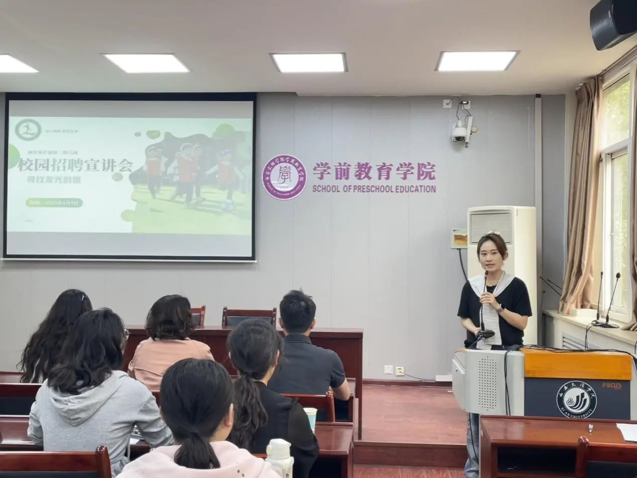 在宣讲环节,王美美园长以“一名新手教师的成长之路”为主题,通过真实案例生动呈现了幼儿园的职业发展路径及工作环境,并针对同学们关心的薪资待遇、培训体系等问题逐一解答。宣讲互动环节,王园长结合自身20年从业经验,分享了“家长工作三心法则”(耐心倾听、诚心沟通、匠心引导),并现场演示了家园沟通的情景模拟,赢得阵阵掌声。