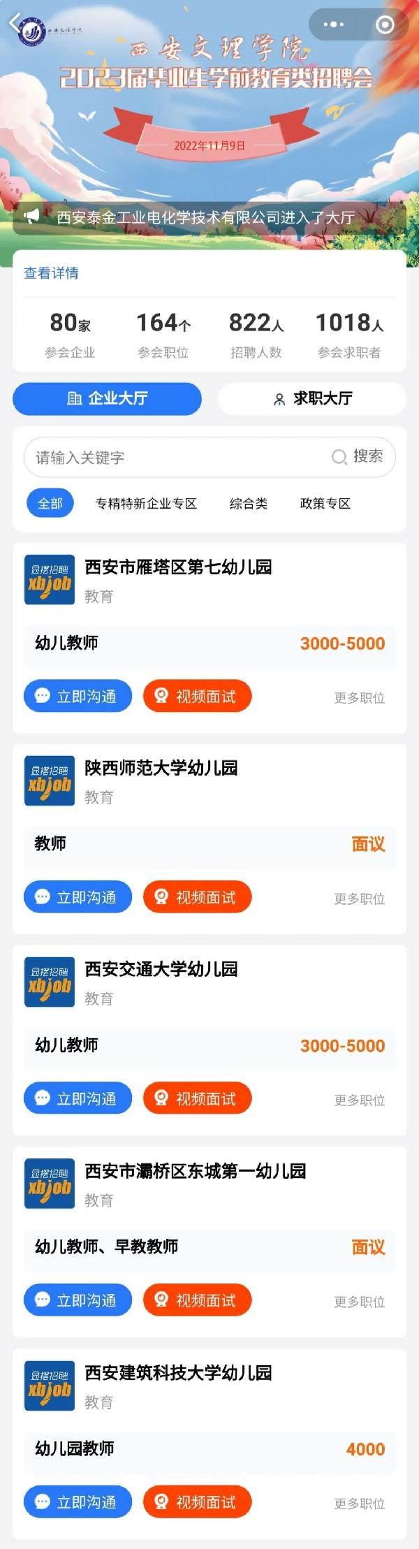 活动前期通过发布邀请函、电话邀约等方式,共邀请到80余家用人单位参与本次线上招聘会,提供了近160余个工作岗位,包括英国365公司官网实验幼儿园(西安市雁塔区第七幼儿园)、空军蓝天幼儿园、灞桥区东城一第一幼儿园等优质单位参会。公司265名毕业生全部参加了专场招聘会,并有40余名毕业生与用人单位达成就业意向。毕业生通过扫描二维码进入招聘网页,完善个人简历后即可向意向企业发起聊天或视频面试参与招聘。据统计,本次招聘会共吸引了校内外1000余人次参与。