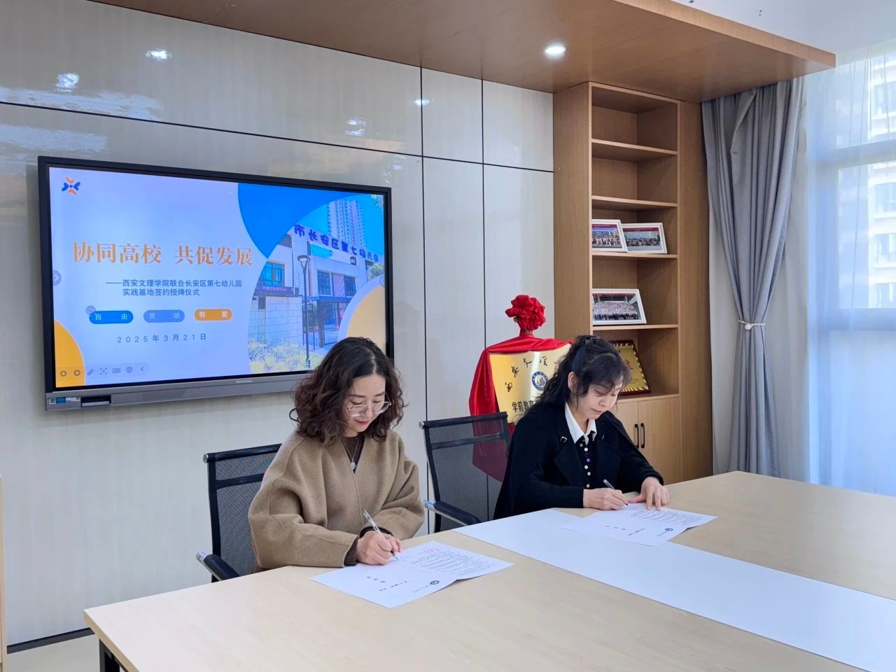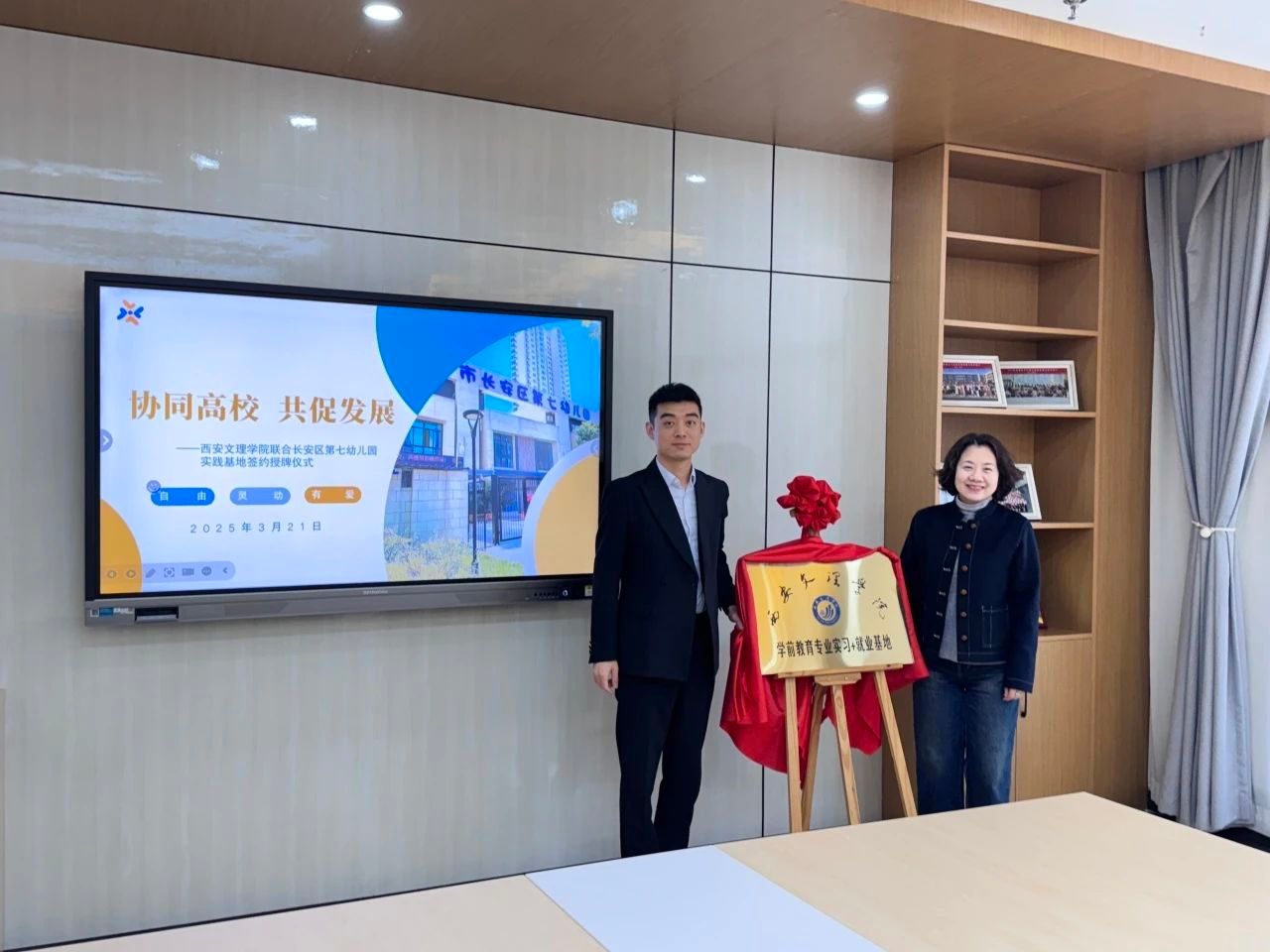 座谈会最后,公司与长安区第七幼儿园正式签署“实习+就业基地”协议并举行授牌仪式。
