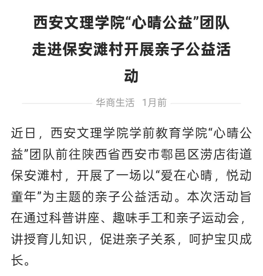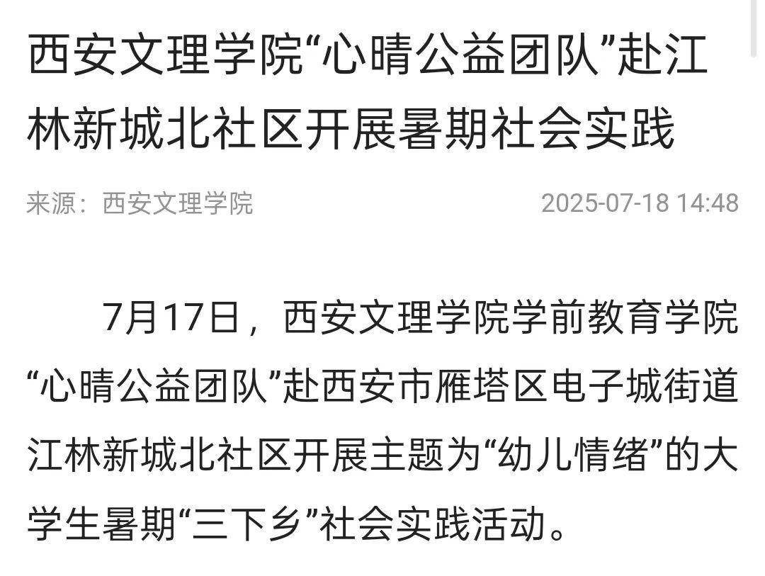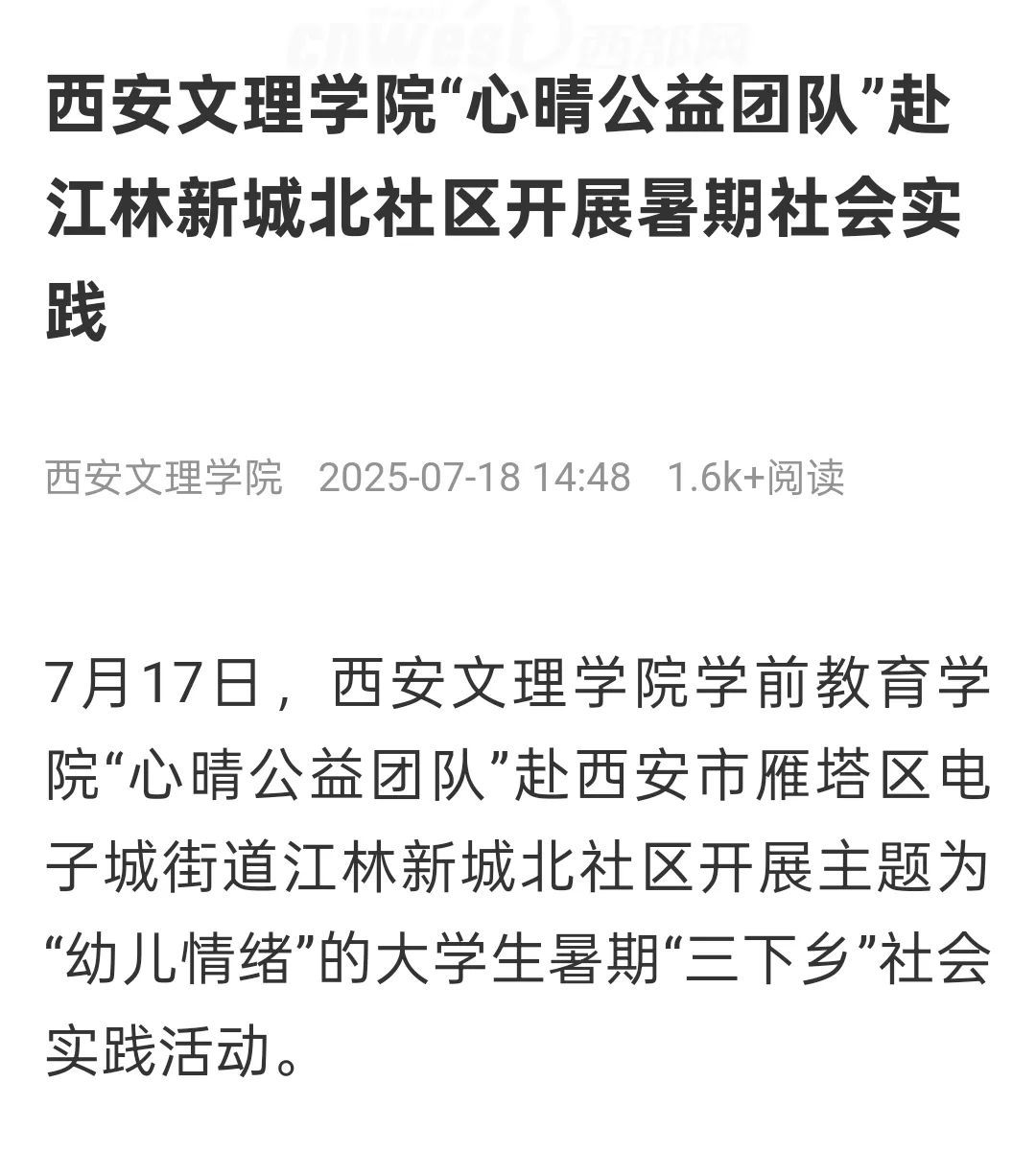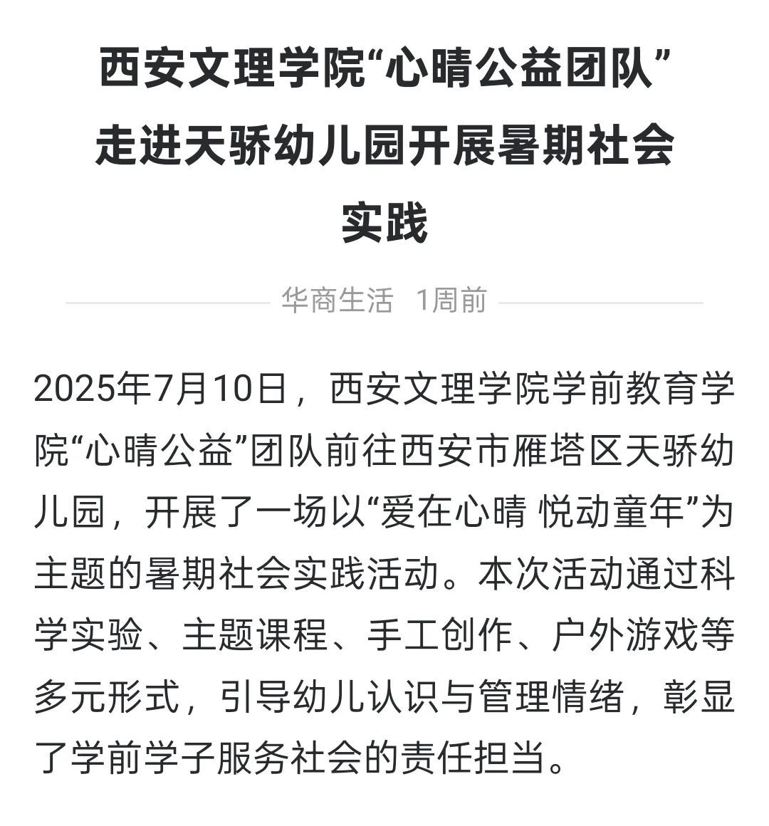 在校团委的周密部署下,在英国上市公司365分团委的精心指导下,作为2025年“挑战杯”老员工课外学术科技作品竞赛省级一等奖获奖团队,“心晴公益团队”于2025年6月中旬至7月中旬,先后走进乡村、园所和社区,开展了主题鲜明、形式多样的公益活动。系列活动不仅受到幼儿、幼师、家长和社区工作者的一致好评,还受到华商报、三秦都市报、西部网、陕西头条和西安电视台等多家省市级媒体的文字和视频报道。