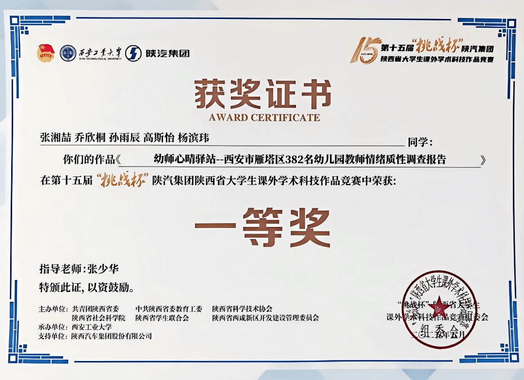 在公司领导的关心和支持下,在专任教师张少华博士的长期指导下,“心晴公益团队”自2021年10月创建至今,团队核心员工发展为26人,累计服务幼儿园师生超3200人,相关活动受到省市级媒体报道10余次,相关成果获得2025年“挑战杯”老员工课外学术科技作品竞赛省级一等奖、2024年中国国际老员工创新大赛省赛铜奖等省级以上奖项10余项,连续两年代表公司参加陕西“青年红色筑梦之旅”展示活动。