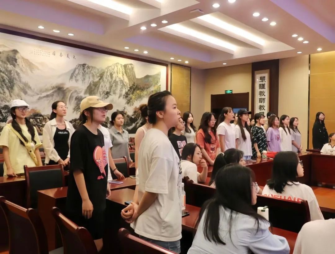 会议最后,2022级创新实验班全体员工在班长的带领下重温班训,相信热爱儿童,献身教育的学前精神会一届届薪火相传,点亮学前人的天空。