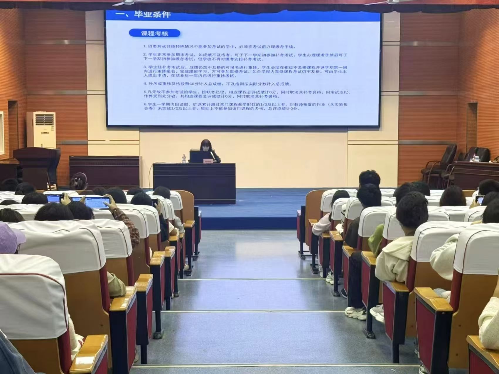 接着,任瑞娟老师系统讲解了学籍管理规定,特别强调了学籍预警、课程考核及旷课处分的具体要求,并详细说明了辅修学位的选修条件及其相关规定。此外,她向同学们介绍了公司的学位授予和救济条件,鼓励大家脚踏实地,认真钻研专业知识,并表达了对同学们学业顺利、生活愉快的美好祝愿。