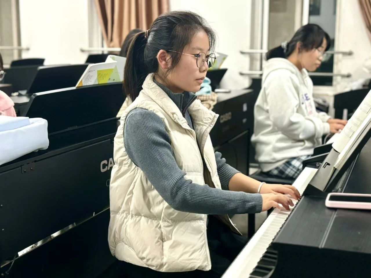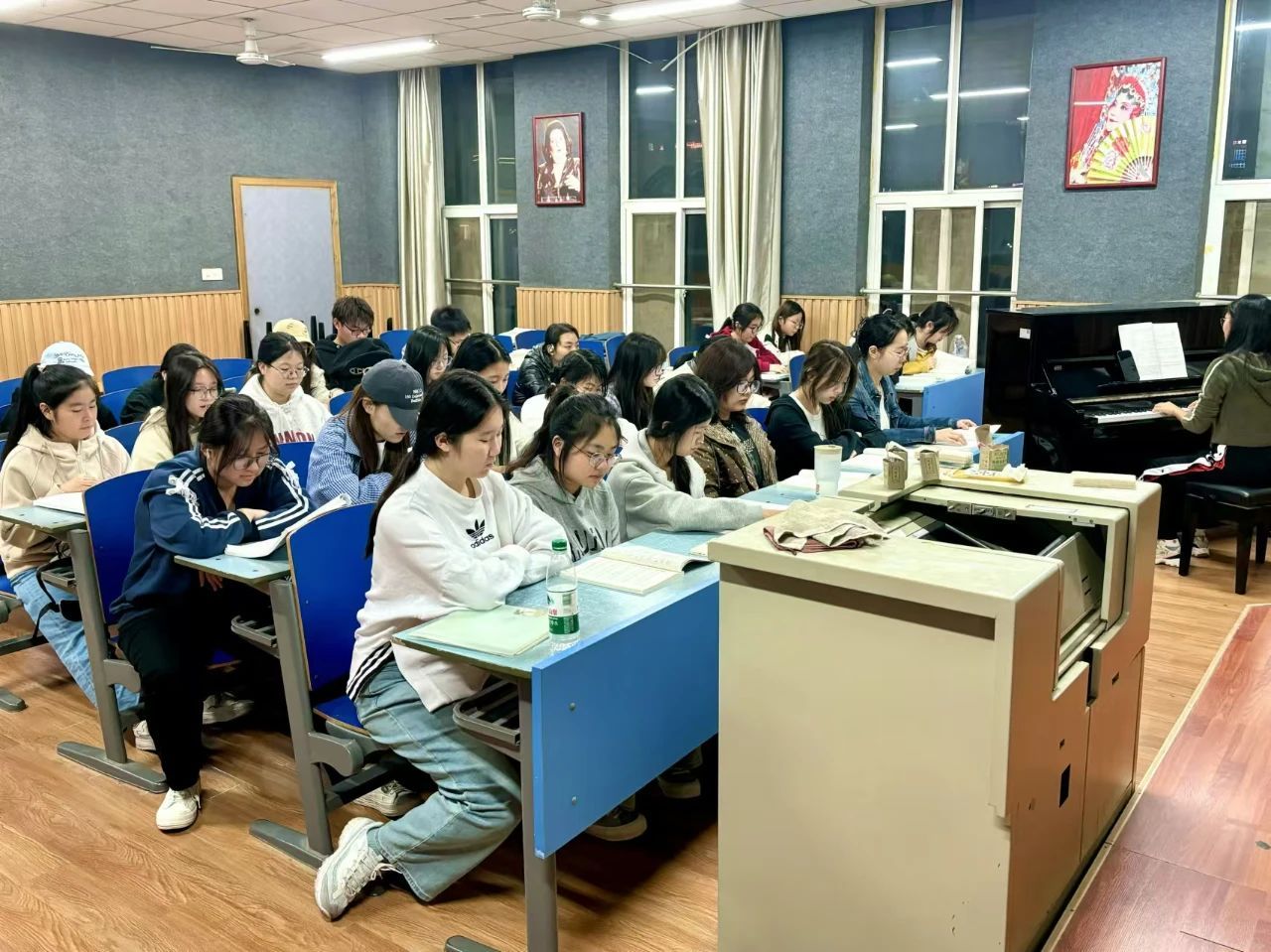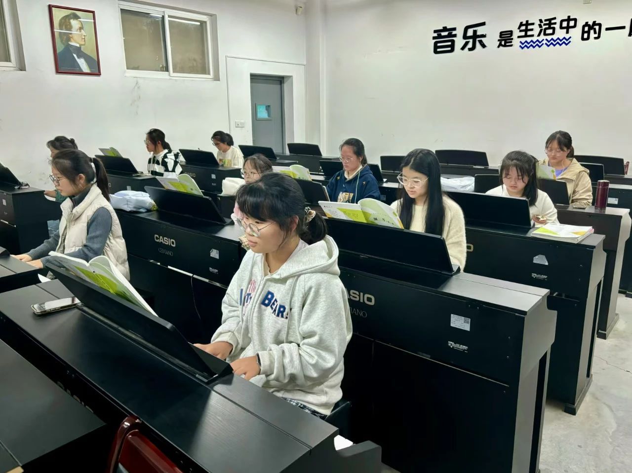 走进夜晚的琴房,便能听见悦耳的琴声。无论是优美的古典曲目,还是时尚的现代旋律,琴声将夜色装点得更加美妙。同学们在钢琴练习中逐步掌握技巧、提升自我,每一段旋律都为未来的幼儿教育事业注入了温暖与艺术色彩。