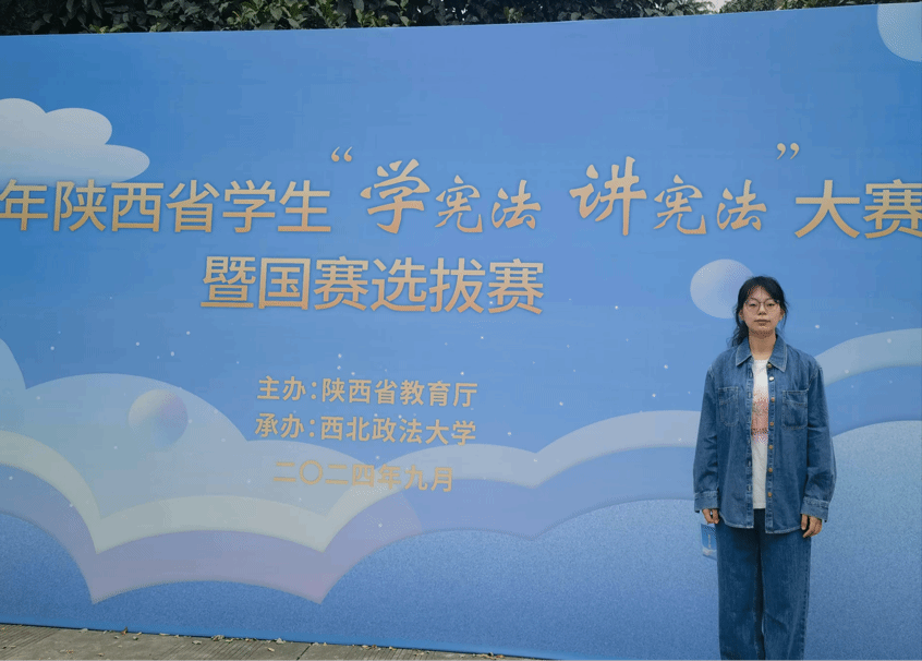 此次参与陕西省第九届“学宪法,讲宪法”素质大赛,对我来说是一次难得的机会,使我受益匪浅。通过参赛,让我意识到“学宪法,讲宪法”大赛不仅是对知识的竞赛,更是演讲能力的展示。在备赛过程中,我学会了如何清晰、有力地表达观点,并在老师的指导下积极练习如何在演讲中吸引听众注意,在客观题解答的过程中同时保持严谨专业和贴近生活。本次参赛经历不仅让我深入理解了宪法的内容与意义,提升了我的演讲与表达能力,更增强了我对宪法和法治的认同。我将接过时代的接力棒,以法律己,做到尊法、学法、守法、用法,做到内化于心、外化于行,让宪法精神成为我们生活的指引。