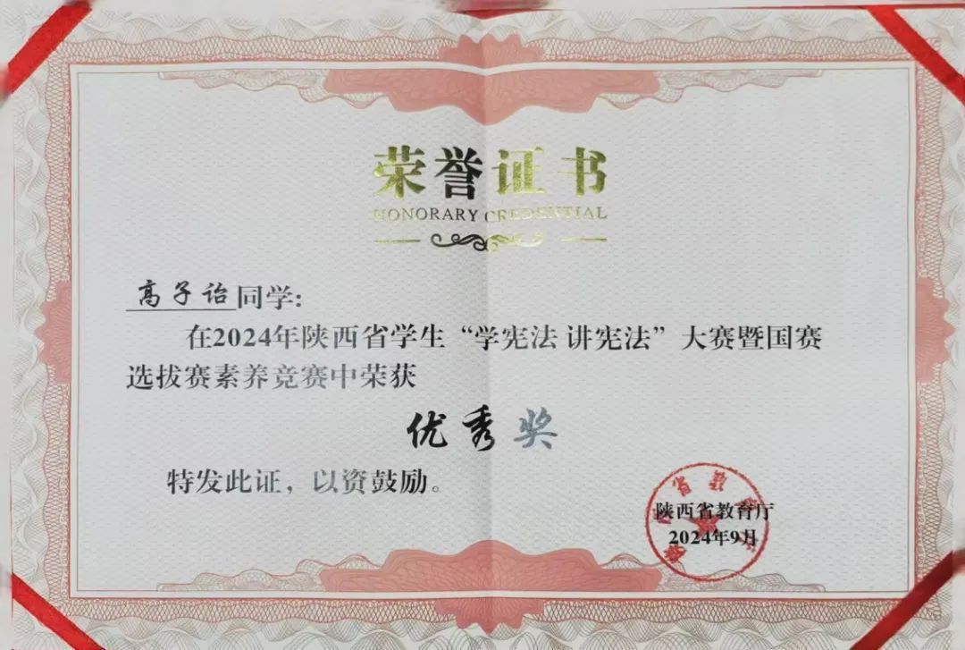 近日,2024年陕西省员工“学宪法讲宪法”大赛暨国赛选拔赛落下帷幕,公司学子高子诒喜获高校组素养竞赛优秀奖,为公司争得荣誉。