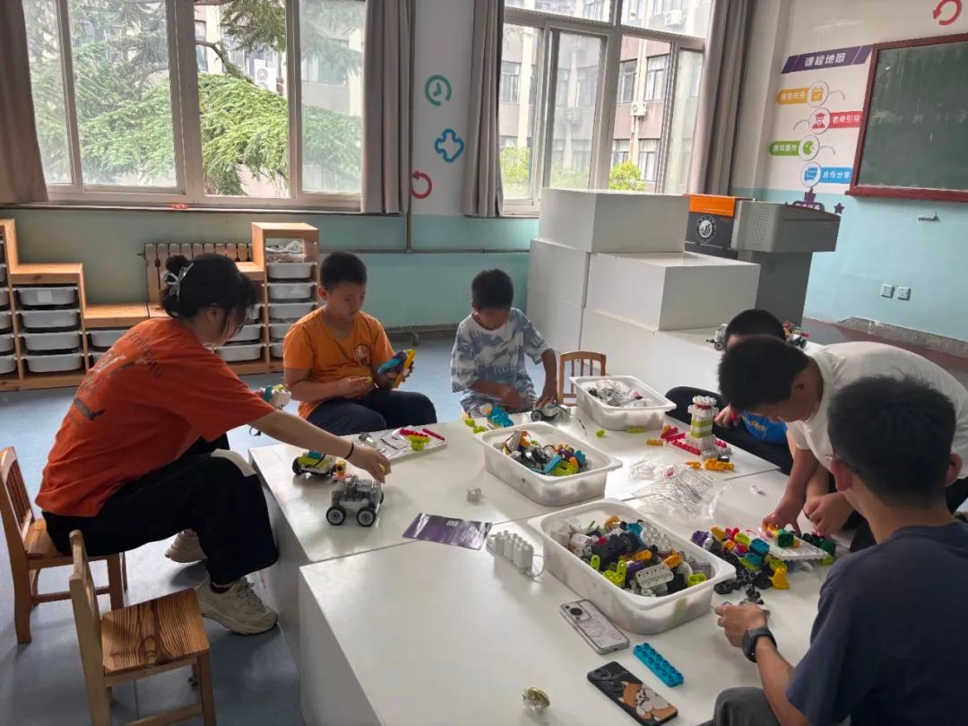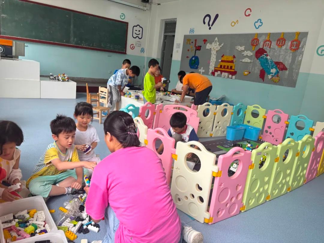 当天上午,孩子们在老师和志愿者的引导下进行了自我介绍和兴趣分享,根据各自喜好被分为“泡泡组”“小画家组”“三好员工组”“乐高组”四个小组,分别开展了泡泡泥手工、绘画创作、作业辅导、智能积木搭建和户外游戏等活动。