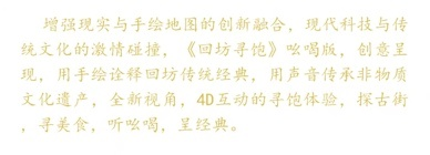 1.谈话导入:小朋友,我们山西都有哪些好吃的美食呀? 2.图片展示:4D《回坊寻饱》吆喝版回民街手绘风情游览图,引发幼儿对西安回民街美食的探索欲望。 | 幼儿根据已有生活经验回顾,能说出家乡的美食,并通过4D互动的形式,初步了解回民街平面图及代表性美食。 | 谈话和4D手绘游览图导入,激发幼儿参与西安回民街非遗美食探索的热情和兴趣。 |