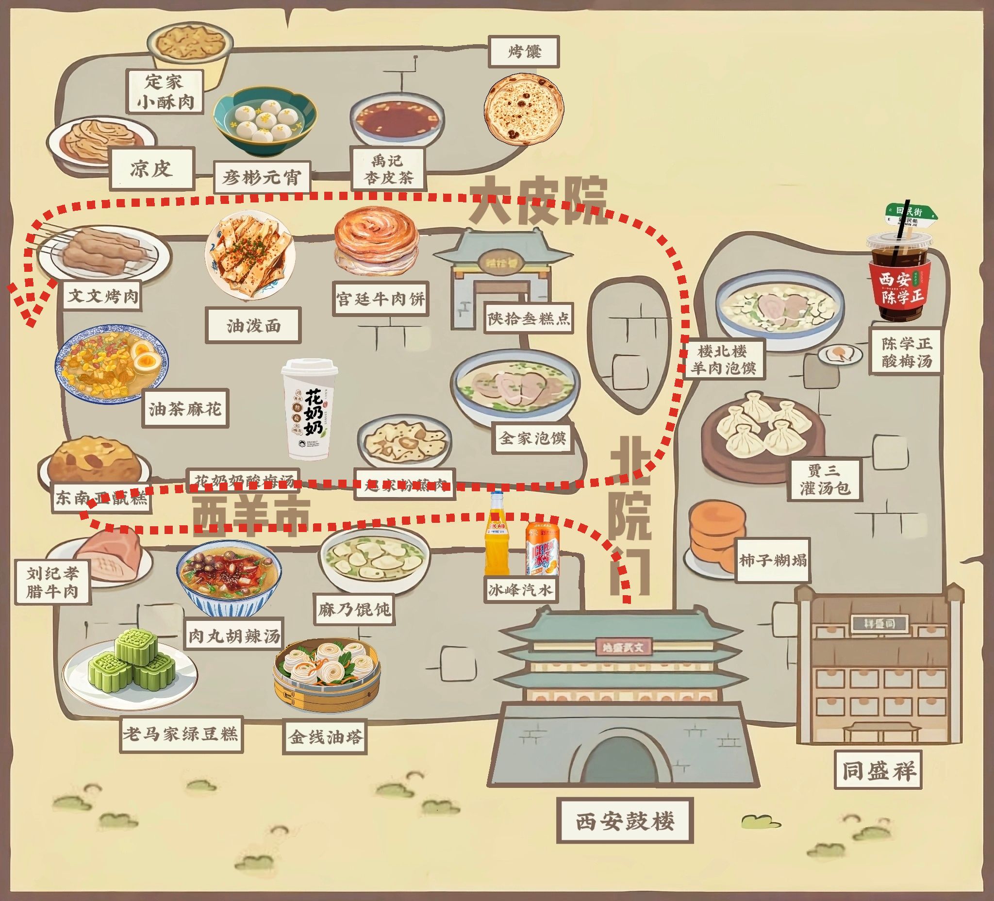 幼儿学习目标 | 1.认知:了解西安回民街平面图内容,有初步的规划意识。 2.情感:愿意倾听、接纳他人的意见,体验交往的快乐。 3.技能:能与同伴协商合作,规划出探寻美食的最优路线。 |